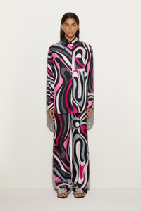An iconic garment that combines elegance and modernity. This silk shirt features a slightly oversized fit and a length designed to add comfort and style to any look. The classic collar and button closure lend a timeless touch, while the Marmo print in black and fuchsia turns the design into a true work of art.The side pocket adds a practical and contemporary note to the garment. - To offer you a unique Pucci garment, we use an all-over print that makes the product unrepeatable. Therefore, the pattern print may vary from the one displayed in the photo. - Black and Fuchsia - 100% silk - Long sleeves with collar and button closure - Slightly oversized length with comfortable fit - Side pocket - Marmo print - Gently dry clean - Made in Italy. - ID: 5HRJ095H761003 - The model is 176 cm tall and wears a 38 italian size.