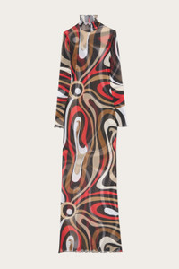 A second-skin effect garment that combines transparency and iconic Pucci motifs. This long-sleeved dress is made from lightweight, stretchy tulle that is soft to the touch and perfect for hugging the silhouette. The high neck adds a touch of modern elegance, while the gold and red Marmo print adds movement and character for a sensual yet refined look. - Gold and Red - Lightweight, stretchy tulle with a second-skin effect - 100% polyamide - Long sleeves - High neck - Fitted fit - Delicate wash max 30°C - Made in Italy - ID: 5UJI255U769006