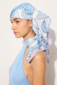 A timeless accessory that embodies all the elegance and color of the Pucci world. This silk twill scarf, with its iconic light blue and pink print, is the perfect detail to brighten up any look. Versatile and sophisticated, it can be worn around the neck, tied in the hair, or knotted to a bag for an unmistakable touch of class. A piece that speaks of style and personality, ideal for any occasion. - To offer you a unique Pucci garment, we use an all-over print that makes the product unrepeatable. Therefore, the pattern print may vary from the one displayed in the photo. - Light Blue and Pink - 100% Silk - Dimensions 90x90 cm - Gently dry clean. - Made in Italy - ID: 6HGB466HC152
