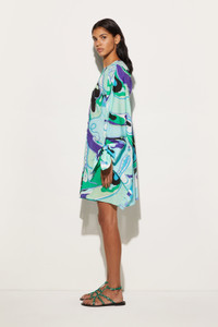 A garment with an ethereal silhouette that embodies the relaxed elegance typical of the Pucci style. This fluid kaftan features a round neckline and long cape sleeves, creating a delicate play of volume and movement. Ties at the cuffs add a refined touch, allowing the fit to be adjusted gracefully and lightly.The Orchidee print in green and lilac gives the fabric a dynamic and sophisticated effect, making this kaftan perfect for relaxed moments and special occasions in comfort and style. - To offer you a unique Pucci garment, we use an all-over print that makes the product unrepeatable. Therefore, the pattern print may vary from the one displayed in the photo. - Green and lilac - 100% Cotton - Long sleeves with cape - Round neck - Laces at cuffs - Fluid and lightweight fabric - Hand wash. - Made in Italy - ID: 5HRL715H734025 - he model is 176 cm tall and wears Italian size 38.