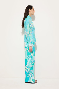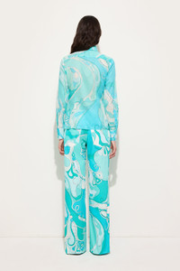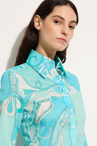 A minimalist silhouette that lets Pucci prints take center stage: this long-sleeved shirt pays homage to the natural grace of the iconic Orchidee print. Reinterpreted in vibrant turquoise, the pattern—first created in 1966—evokes Eastern aesthetics and the sinuous lines of nature, recalling tree bark and the elegance of stylized flowers. Made from lightweight cotton muslin, the fabric has a pleasantly soft feel and a naturally draping fit. The slim cut flatters the figure, while the regular shoulders and classic collar make it a versatile piece that can be worn with ease in both everyday and sophisticated settings. - To offer you a unique Pucci garment, we use an all-over print that makes the product unrepeatable. Therefore, the pattern print may vary from the one displayed in the photo. - Turquoise - 100% cotton - Classic collar - Long sleeves - Front button closure - Slim fit - Regular shoulders - Wash at max 30°C - Made in Italy - ID: 5URJ265U734019