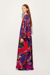 A long kaftan that expresses fluid, sophisticated elegance thanks to its wide silhouette and cape sleeves that tie at the wrists, creating an enveloping, dramatic effect. Crafted in pure silk, the garment is decorated with the Orchidee print, an archive motif from 1966. Inspired by Southeast Asian artisans and lush nature, this print stylizes flowers in soft, enveloping curves, transforming the fabric into a dreamlike garden with a strong visual impact. - To offer you a unique Pucci garment, we use an all-over print that makes the product unrepeatable. Therefore, the pattern print may vary from the one displayed in the photo. - Multicolor - 100% silk - Long kaftan - Cape sleeves with wrist closure - Flowing, enveloping silhouette - Delicate dry clean - Made in Italy - ID: 5URL665U731017