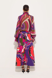 Femininity and lightness come together in this midi skirt featuring an elegant slit along the leg, which adds movement and sensuality to the silhouette. The rounded hem and belt closure at the waist complete the design. The multicolored Orchidee print envelops the garment with its graphic and natural charm, inspired by Eastern aesthetics. - To offer you a unique Pucci garment, we use an all-over print that makes the product unrepeatable. Therefore, the pattern print may vary from the one displayed in the photo. - Multicolor - Main fabric: 96% viscose – 4% elastane - Secondary fabric: 100% cotton – Lining: 67% acetate – 33% polyester - Rounded hem - Waist belt closure - Deep slit on the leg - For washing instructions, refer to the label on the garment - Made in Italy - ID: 5URW085U738017