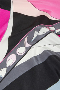 An elegant and versatile stole designed to add a refined and personal touch to your style. Made of fine silk crepe de chine, it combines the lightness of the fabric with the vibrancy of the Pesci print in black and fuchsia, recalling the dynamism of the sea and Pucci's artistry.Thanks to its size, it can be used in different ways: draped over an evening dress, worn as a hijab or knotted to embellish a casual look. Its fluid texture and timeless design make it a must-have piece for any wardrobe. - Black and fuchsia - 100% Silk crepe de chine - Dimensions: 180x65 cm - Pesci print - Gently dry clean. - Made in Italy - ID: 5HGB805HC241