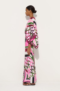 This ensemble brings together two key pieces from the capsule collection: the long silk dress and matching shrug, both featuring the Vivara print in pink and khaki. The fluid, marine-inspired geometric patterns create a graphic effect reminiscent of the waves and organic shapes of the Mediterranean. The dress features a flowing silhouette with thin straps and a V-neckline, while the shrug, with wide sleeves and decorated edges, adds volume and movement, transforming the look into an elegant and iconic piece. A contemporary tribute to the brand's history, reinterpreted in a refined key. - To offer you a unique Pucci garment, we use an all-over print that makes the product unrepeatable. Therefore, the pattern print may vary from the one displayed in the photo. - Pink and Khaki - 100% silk - Dress with thin straps and V-neckline - Shrug with wide sleeves - Decorated edges - Dry clean only - Made in Italy - ID: 5URI335U730P11