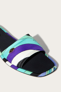 Perfect for a promenade or for adding a touch of elegance to an outdoor aperitif, these silk twill sandals are your ticket to effortless, refined style.The Pucci print in the Iride variant in green and lilac lends vibrancy and femininity, turning a simple sandal into a luxurious accessory.The front band with logo plaque adds a distinctive and sophisticated touch, while the silk twill wraps the foot lightly. - Green and lilac - Printed silk twill - Logo plaque on front band - Iride print - ID: 5HCA035H151059