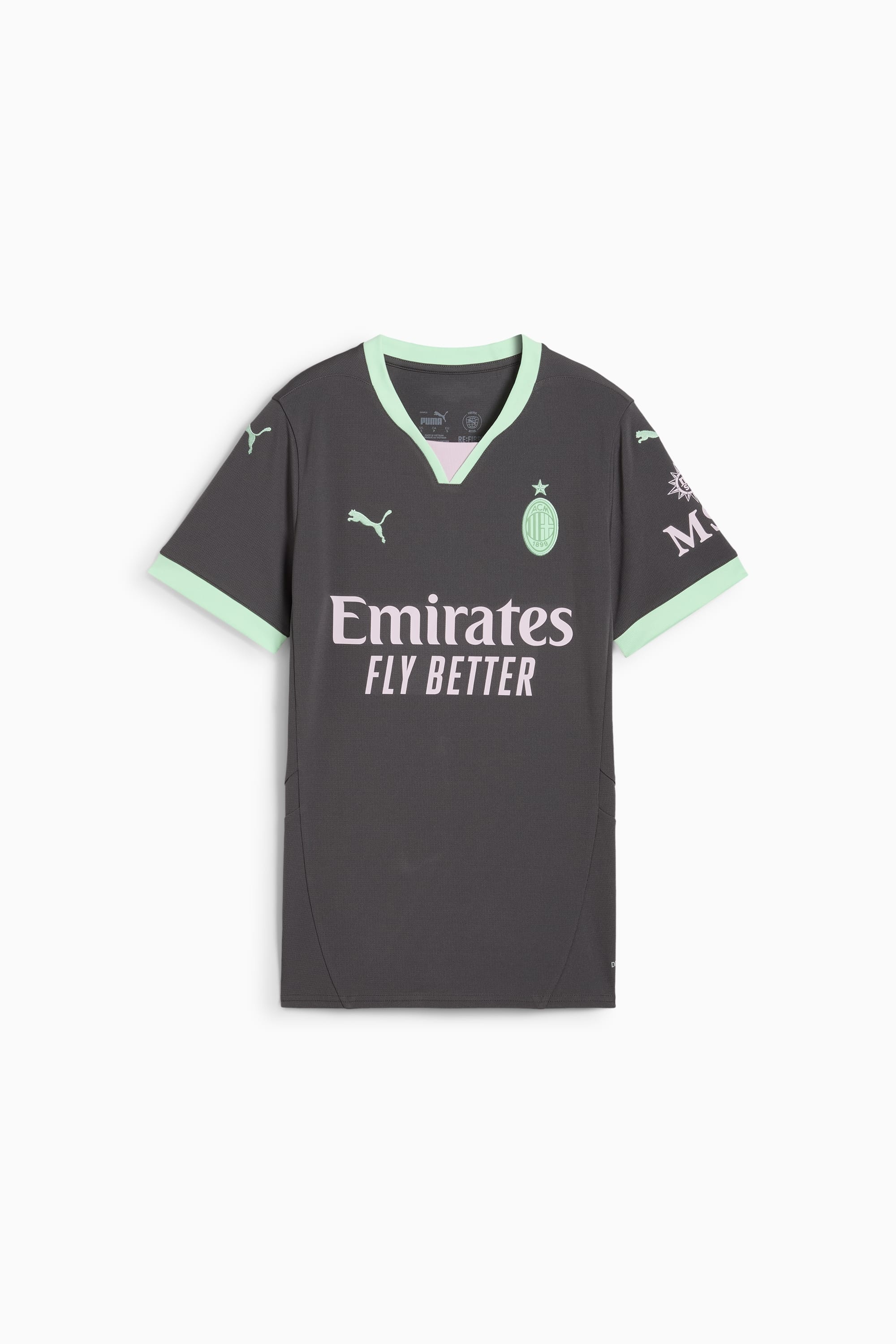 PRODUCT STORY In the 24/25 Third Kit, a neutral base color lights up in bold accents – including monochromatic version of the club crest – to express the inherent Milanese style in a way that’s both new and distinctly Rossonero, even in the absence of Rosso or Nero. Welcome to Milan(ismo). FEATURES & BENEFITS - dryCELL: Performance technology designed to wick moisture from the body and keep you free of sweat during exercise - As part of the RE:FIBRE program, this garment is made of at least 95% recycled material from textile waste and other used materials DETAILS - Style: 775036_03 - Color: Shadow Gray-Fresh Mint - Regular fit - 170 gsm, Jacquard - Crew neck - Short sleeves - Official team branding MATERIAL INFORMATION - SHELL: 100% polyester - RIB: 100% polyester