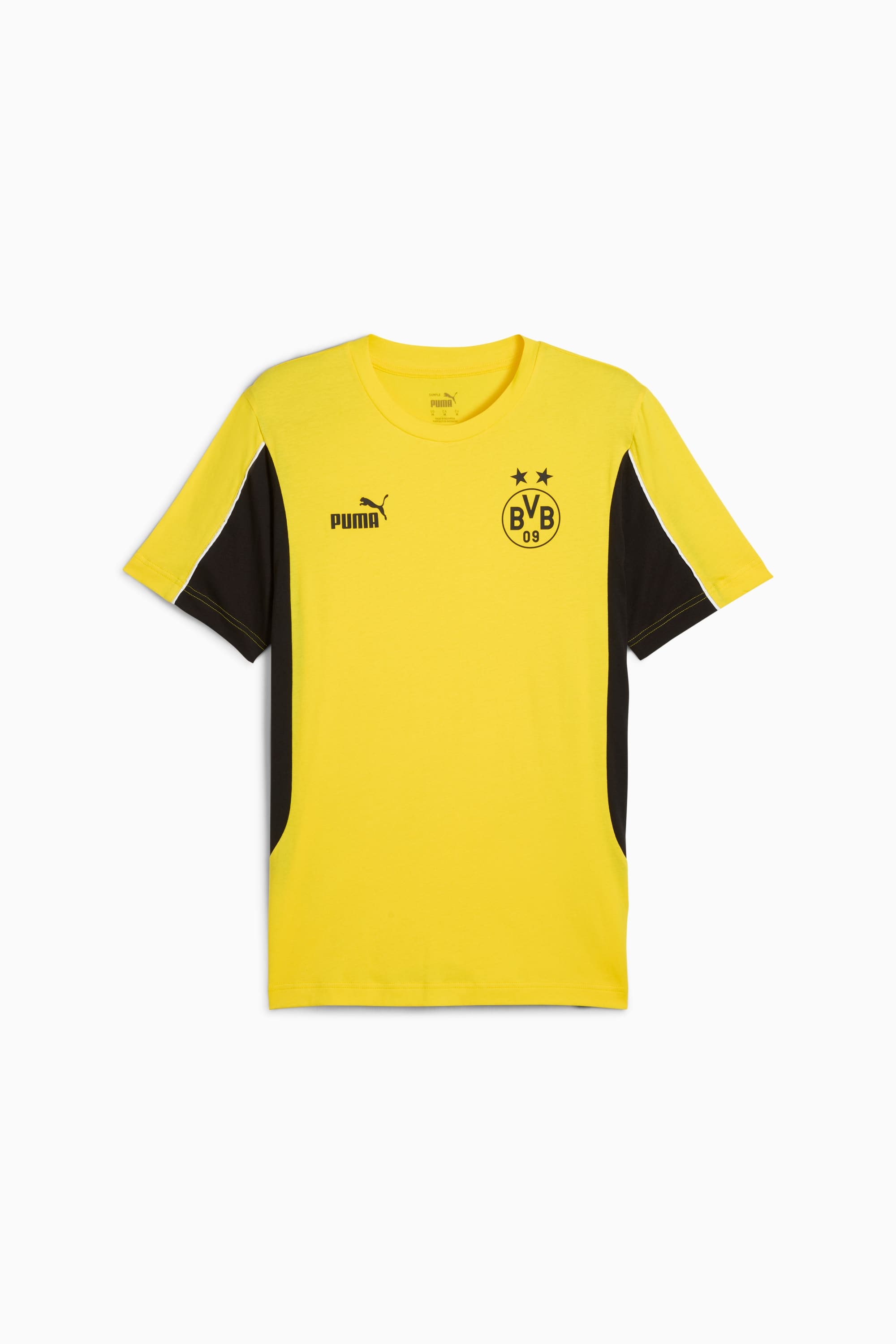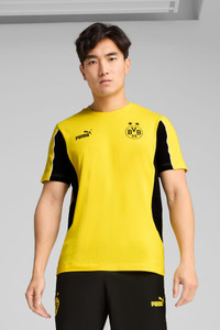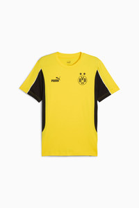 PRODUCT STORY Show your love for Die Schwarzgelben with this tee featuring the BVB badge on the left of the chest and a PUMA Cat logo on the right. The regular fit and the rubber print details make it a fan favourite. Time to show your true colors to the world. FEATURES & BENEFITS - Made with at least 20% recycled cotton DETAILS - Style: 779107_01 - Color: Faster Yellow-PUMA Black - Regular fit - Single jersey material - Regular length - Crew neck - Short sleeves - PUMA Cat logo on the right chest - BVB badge on the left chest MATERIAL INFORMATION - SHELL: 100% cotton