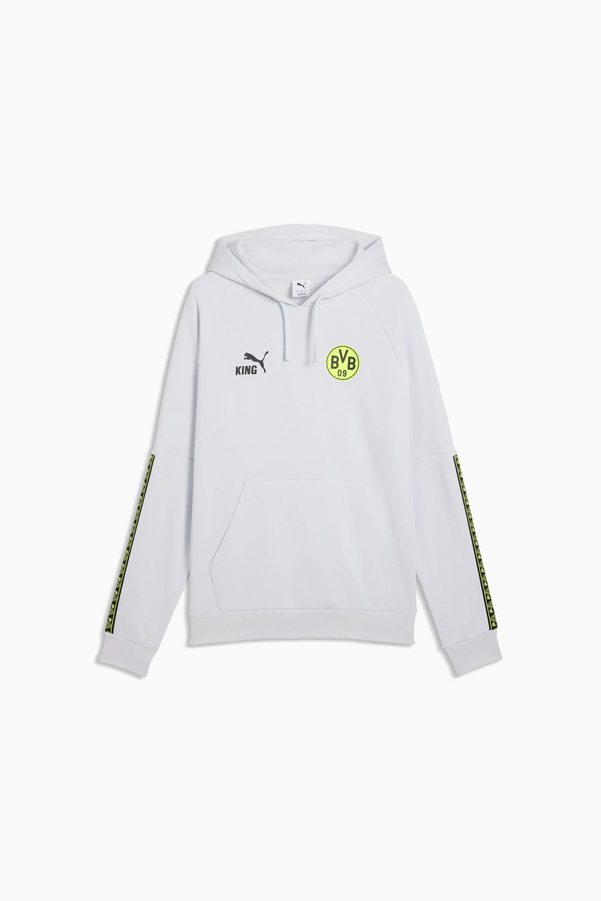 PRODUCT STORY Own your club pride. This Borussia Dortmund hoodie celebrates the legacy of the KING line, blending timeless elements with an archive-inspired aesthetic.It's a tribute to true royalty on and off the pitch. FEATURES & BENEFITS - Made with at least 50% recycled materials. DETAILS - Style: 784632_03 - Color: Silver Mist-Yellow Alert - Fit: Regular - Main material: French Terry - Hooded - Long sleeves - Official team branding MATERIAL INFORMATION - Trimming: 100% polyester - Shell: 68% cotton, 32% polyester - Rib: 97% cotton, 3% elastane