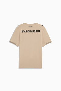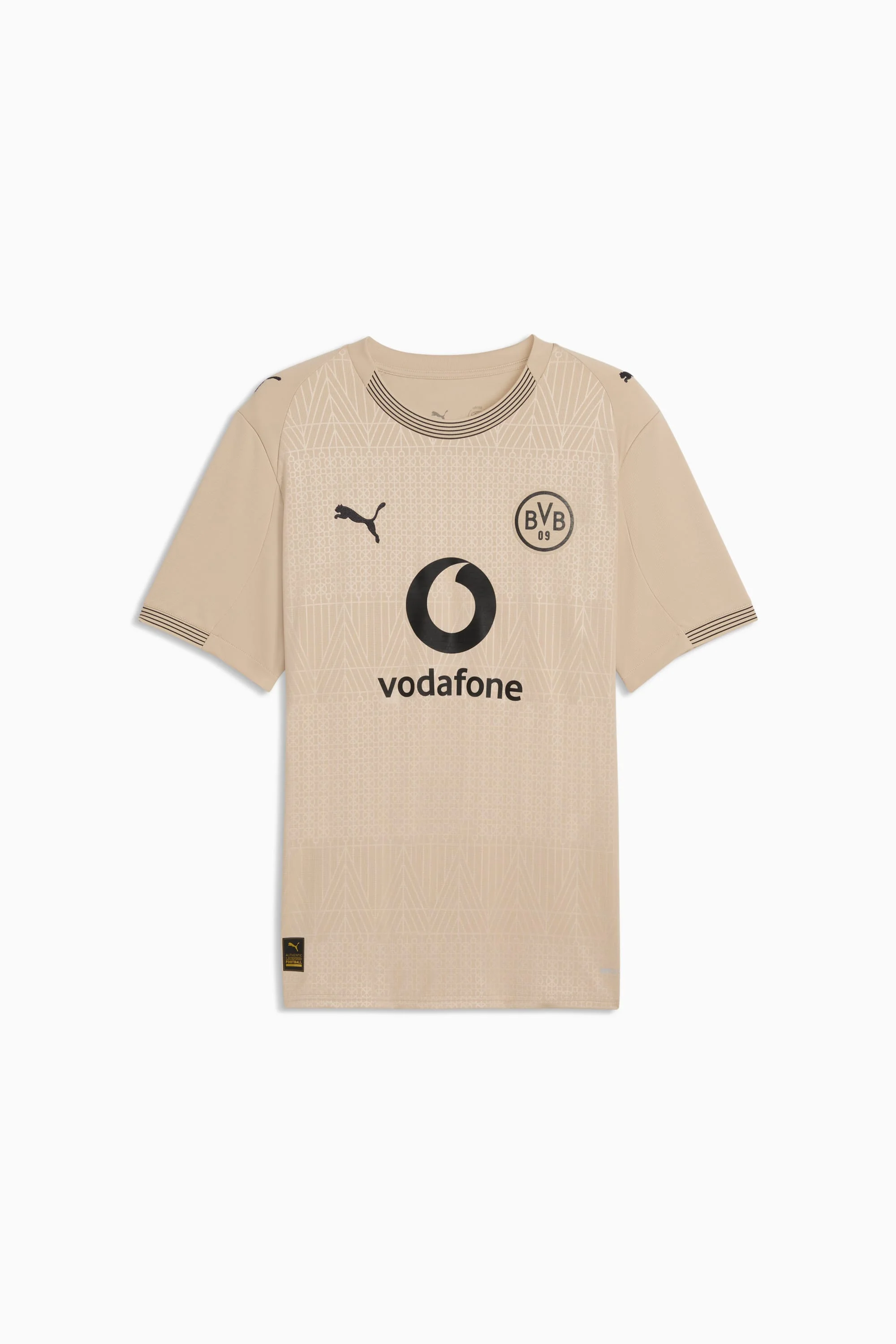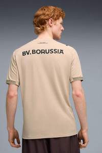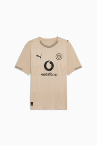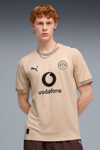 PRODUCT STORY BVB’s 25/26 Special Kit celebrates a century of football at the iconic Stadion Rote Erde– home to countless unforgettable Dortmund moments. With a tonal print that salutes Black and Yellow history, the design reps Rote Erde to the fullest, etching the stadium’s walls and gates into the fabric of the jersey. Complete with a clean sandstone finish, history’s never looked better. FEATURES & BENEFITS - As part of the RE:FIBRE program, this garment is made of at least 95% recycled material from textile waste and other used materials. - MOISTURE MANAGEMENT: Technical dryCELL fabrics wick moisture away from the skin to help keep you dry and comfortable DETAILS - Style: 780118_24 - Color: Alabaster-PUMA Black - Fit: Regular - Neck: Crew neck - Short sleeves - Length: Regular - Official team branding