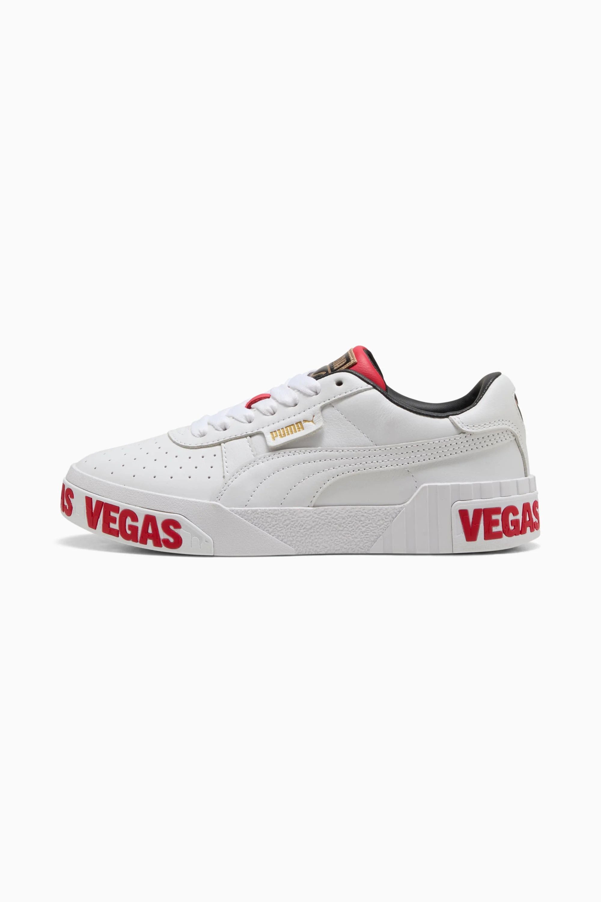 PRODUCT STORY Born from the iconic ‘80s California, the Cali Bold Vegas sneakers bring attitude to a classic. The upper and Vegas branding on the midsole set you apart, so you feel confident - from the city lights to your everyday. You in? DETAILS - Style: 406763_01 - Color: PUMA White-PUMA Black-For All Time Red - Width: Regular - Toe type: Rounded - Closure: Laces - Heel type: Platform - PUMA branding details MATERIAL INFORMATION - Sockliner: 100% Synthetic - Outsole: 100% Rubber - Upper: 100% Leather - cow - Lining: 61.75% Textile, 38.25% Synthetic