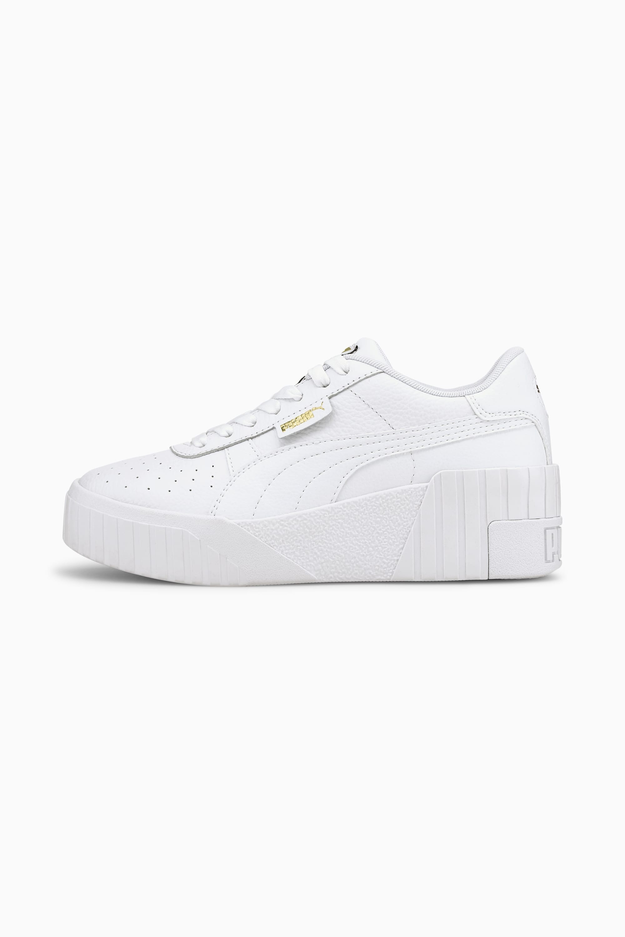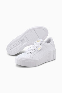 PRODUCT STORY Elevate your street style with the PUMA Cali Wedge Wn's sneakers. These chic wedge trainers offer a trendy twist on a classic silhouette, giving you a boost of height and confidence with every step. The sleek design and subtle PUMA branding make these sneakers a versatile addition to your wardrobe, perfect for pairing with your favourite athleisure looks or dressing up a casual outfit. Step up your shoe game with the Cali Wedge Wn's and stand out from the crowd in style. DETAILS - Style: 373438_01 - Color: Puma White-Puma White - Modern Cali silhouette - Synthetic leather upper with perforated vamp - Full lace closure - Platform midsole design with wedge heel - Rubber outsole provides traction and grip - Gold metallic PUMA branded tab at lateral side - Woven PUMA label at tongue MATERIAL INFORMATION - Midsole: 100% TR (Thermoplastic Rubber) - Sockliner: 100% Textile - Outsole: 100% TR (Thermoplastic Rubber) - Upper: 53.26% Leather, 46.74% Synthetic - Lining: 100% Textile