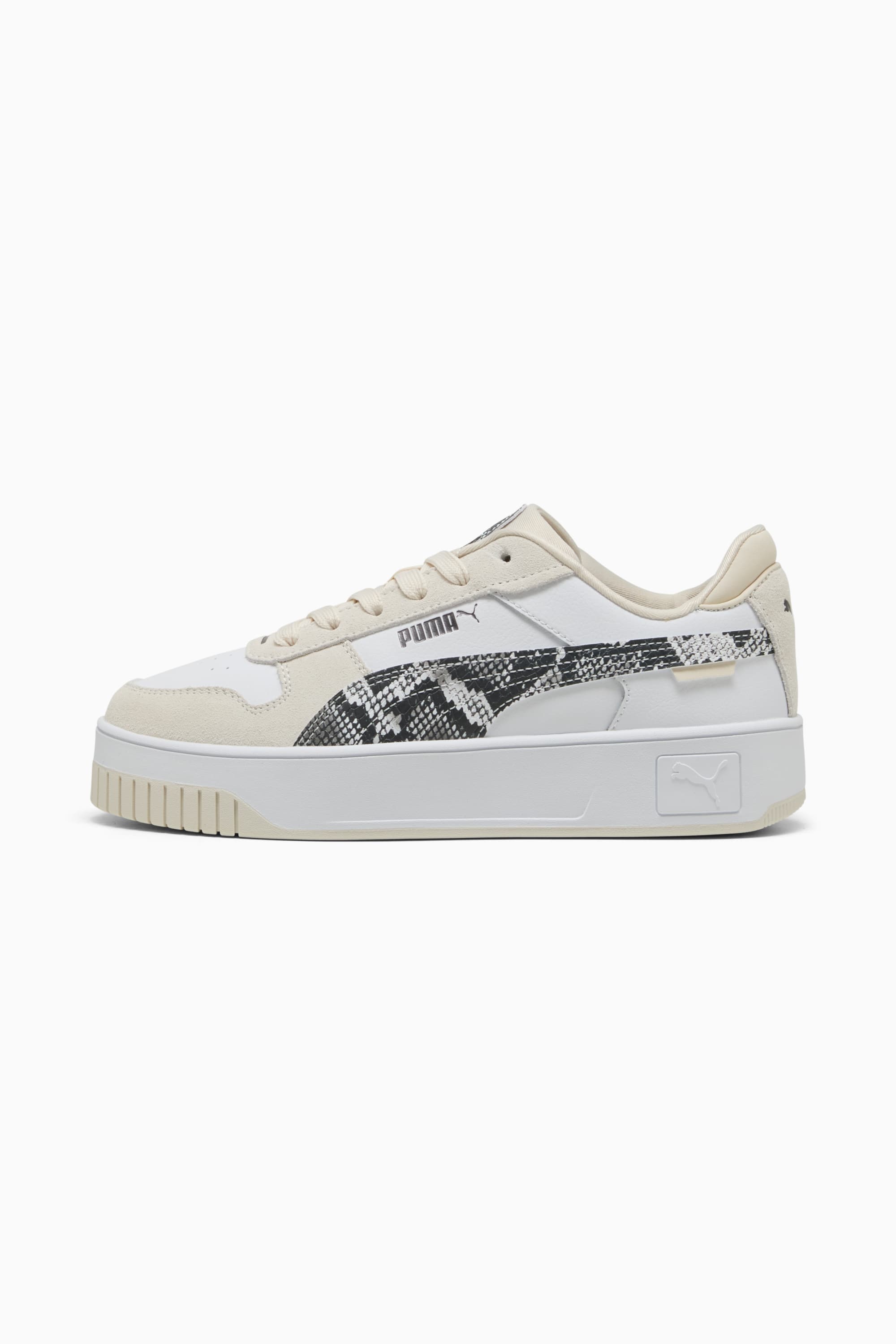 PRODUCT STORY The Carina Street has a streetwear-inspired design in combination with a true platform profile and basketball-inspired details, making it the perfect choice for adding a touch of style to everyday outfit. FEATURES & BENEFITS - PUMA's leather products support responsible manufacturing via the Leather Working Group.www.leatherworkinggroup.com - The upper of the shoes is made with at least 30% recycled materials and the bottom is made with at least 10% recycled materials - SOFTFOAM+: Step-in comfort sockliner designed to provide soft cushioning thanks to its extra thick heel DETAILS - Style: 401611_01 - Color: PUMA White-PUMA Black-Alpine Snow - Low shoe - Synthetic upper - Rubber outsole - Lace closure - PUMA formstrip at lateral sides - PUMA branding details MATERIAL INFORMATION - Sockliner: 100% Textile - Outsole: 100% Rubber - Upper: 54.61% Leather - cow, 43.40% Synthetic, 1.99% Textile - Lining: 100% Textile