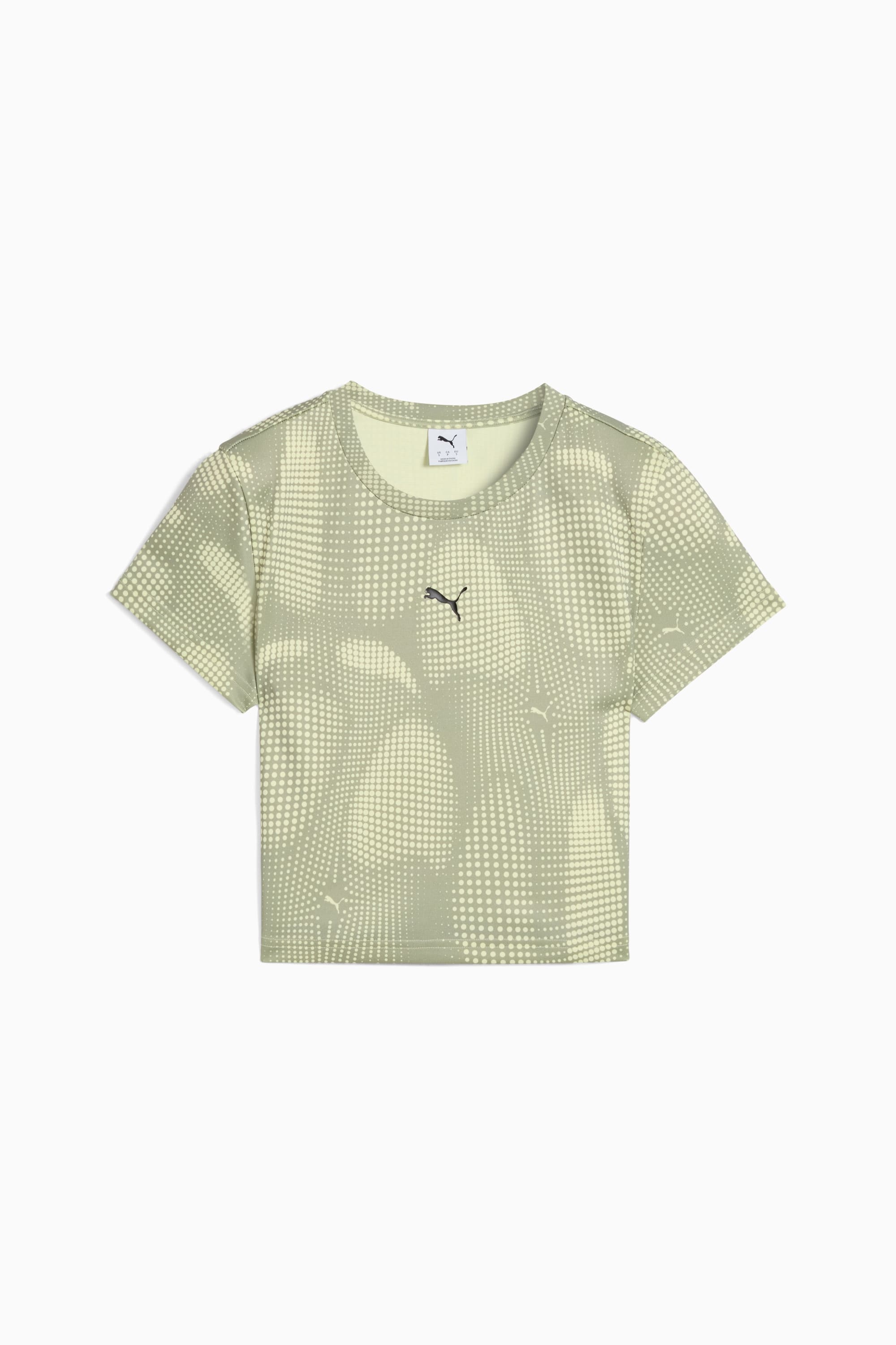 PRODUCT STORY The DARE TO collection makes a statement with bold, fearless designs that push the boundaries of fashion and sport. This season's pieces include wardrobe staples that let you to celebrate your individual style everyday – from puffer jackets, to flared pants to printed tees. Dare to stand out. Dare to be bold. Dare to be you. FEATURES & BENEFITS - Made with at least 90% recycled materials. DETAILS - Style: 632145_82 - Color: Lux Army - Fit: Slim - Main material: Rib - Neck: Crew neck - Short sleeves - Length: Cropped - All-over print MATERIAL INFORMATION - Shell: 97% polyester, 3% elastane - Collar: 97% polyester, 3% elastane