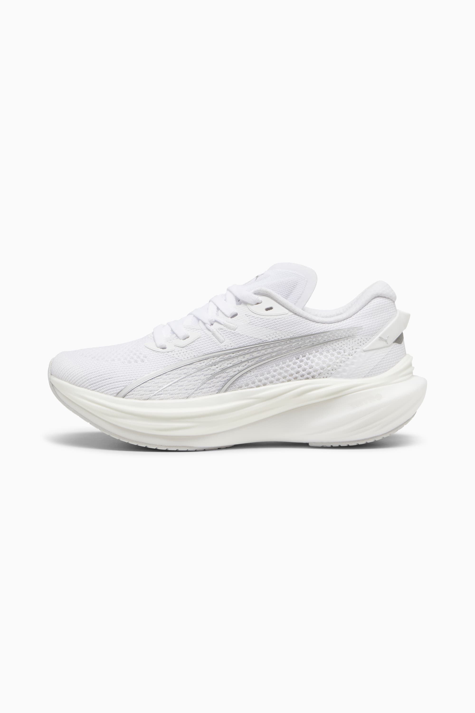 PRODUCT STORY Experience unparalleled propulsion in your everyday road runs with the Deviate NITRO™ 3, featuring PWRPLATE technology and NITRO™ foam. This highly responsive trainer delivers a snappy ride, infusing speed into every stride. FEATURES & BENEFITS - The upper of the shoes is made with at least 20% recycled materials - NITROFOAM™: Advanced nitrogen-infused foam designed to provide superior responsiveness and cushioning in a lightweight package - PWRPLATE: Carbon fibre plate engineered to stabilise the midsole while maximising energy transfer DETAILS - Style: 309708_10 - Color: PUMA White-Feather Gray-PUMA Silver - Regular fit - Engineered mesh upper - Stack height: 39mm/29mm - Weight: 250g (size UK8) - Heel-to-toe drop: 10mm - Recommended for: neutral pronators MATERIAL INFORMATION - Midsole: 100% Synthetic - Sockliner: 100% Textile - Outsole: 100% Rubber - Upper: 73% Textile, 27% Synthetic - Lining: 100% Textile