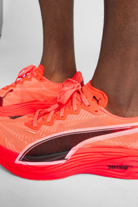 PRODUCT STORY Hit turbo speed. The Deviate NITRO™ Elite 3 is a running shoe redesigned for lightweight, race day propulsion. A carbon fibre PWRPLATE ensures stability and maximum running efficiency, while NITROFOAM™ ELITE offers supreme cushioning that won't weigh you down. It's a running go-to made with lightweight mono-mesh and durable PUMAGRIP rubber for multi-surface traction and an effortless run. FEATURES & BENEFITS - NITROFOAM™ ELITE: Premium performance foam technology that provides pinnacle responsiveness in an extremely lightweight package - PWRPLATE: Carbon fibre plate engineered to stabilise the midsole while maximising energy transfer - ULTRAWEAVE: Ultra-light, engineered fabric with a structured, 4-way stretch that reduces weight and friction. Built for athletes looking to increase speed and strength DETAILS - Style: 309809_06 - Color: Glowing Red-PUMA Black - Regular fit - ULTRAWEAVE upper - Stack height: 40mm/32mm - Weight: 194g (size UK8) - Heel-to-toe drop: 8mm - Recommended for: neutral pronators MATERIAL INFORMATION - Midsole: 100% Synthetic - Sockliner: 100% Textile - Outsole: 87% Rubber, 13% Synthetic - Upper: 82% Textile, 18% Synthetic - Lining: 100% Textile