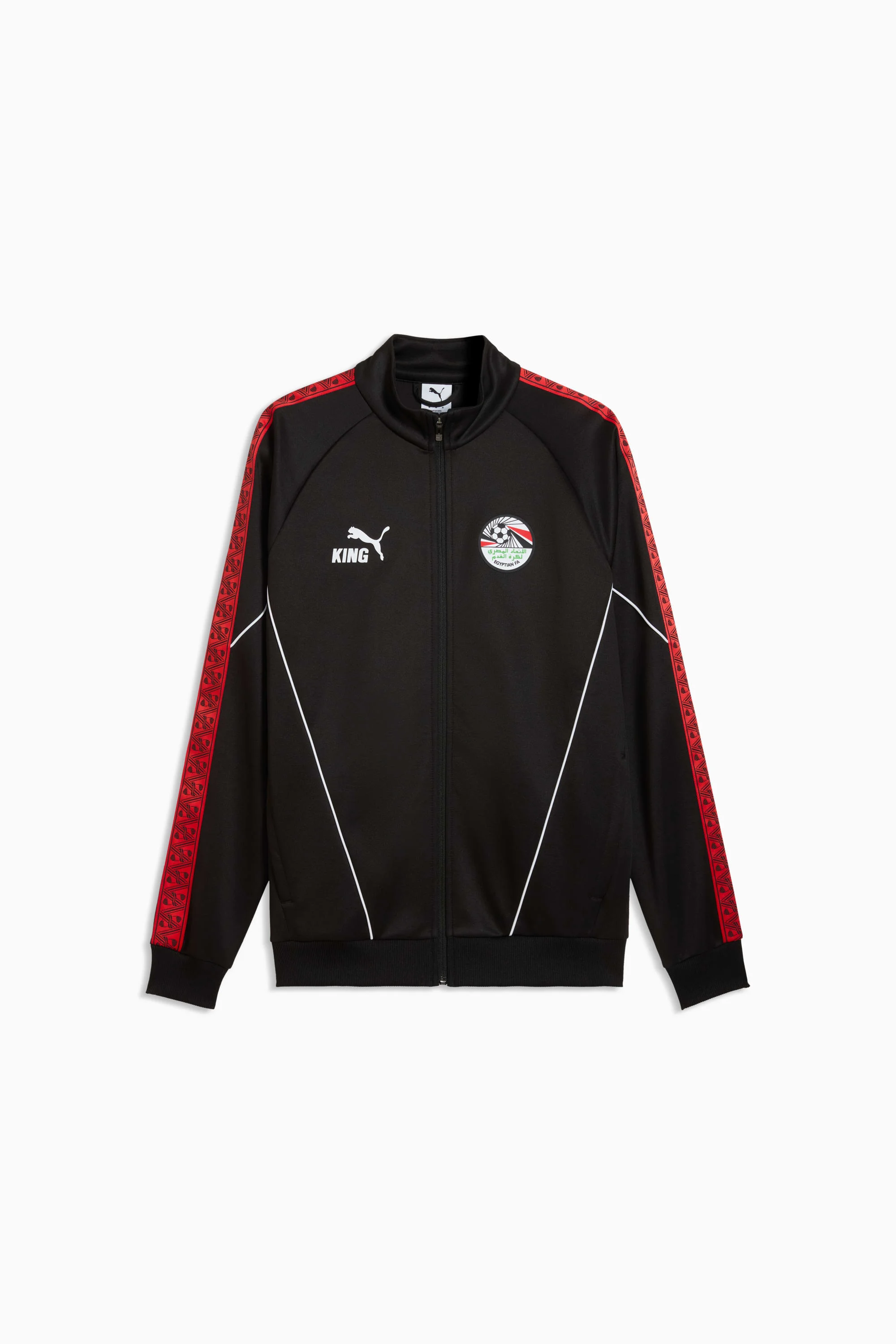 PRODUCT STORY The KING Anthem Collection channels retro vibes with a modern twist, worn by players during their walkouts before every game. With bold, vintage-inspired designs, this Egypt jacket honours your club’s legacy while showcasing your pride, making it a true symbol of loyalty and tradition. FEATURES & BENEFITS - MOISTURE MANAGEMENT: Technical dryCELL fabrics wick moisture away from the skin to help keep you dry and comfortable - Made with at least 50% recycled materials. DETAILS - Style: 784945_06 - Color: PUMA Black-PUMA Red - Fit: Slim - Main material type: Spacer - Neck: Stand-up collar - Long sleeves - Closure: Full zip - Official team branding details