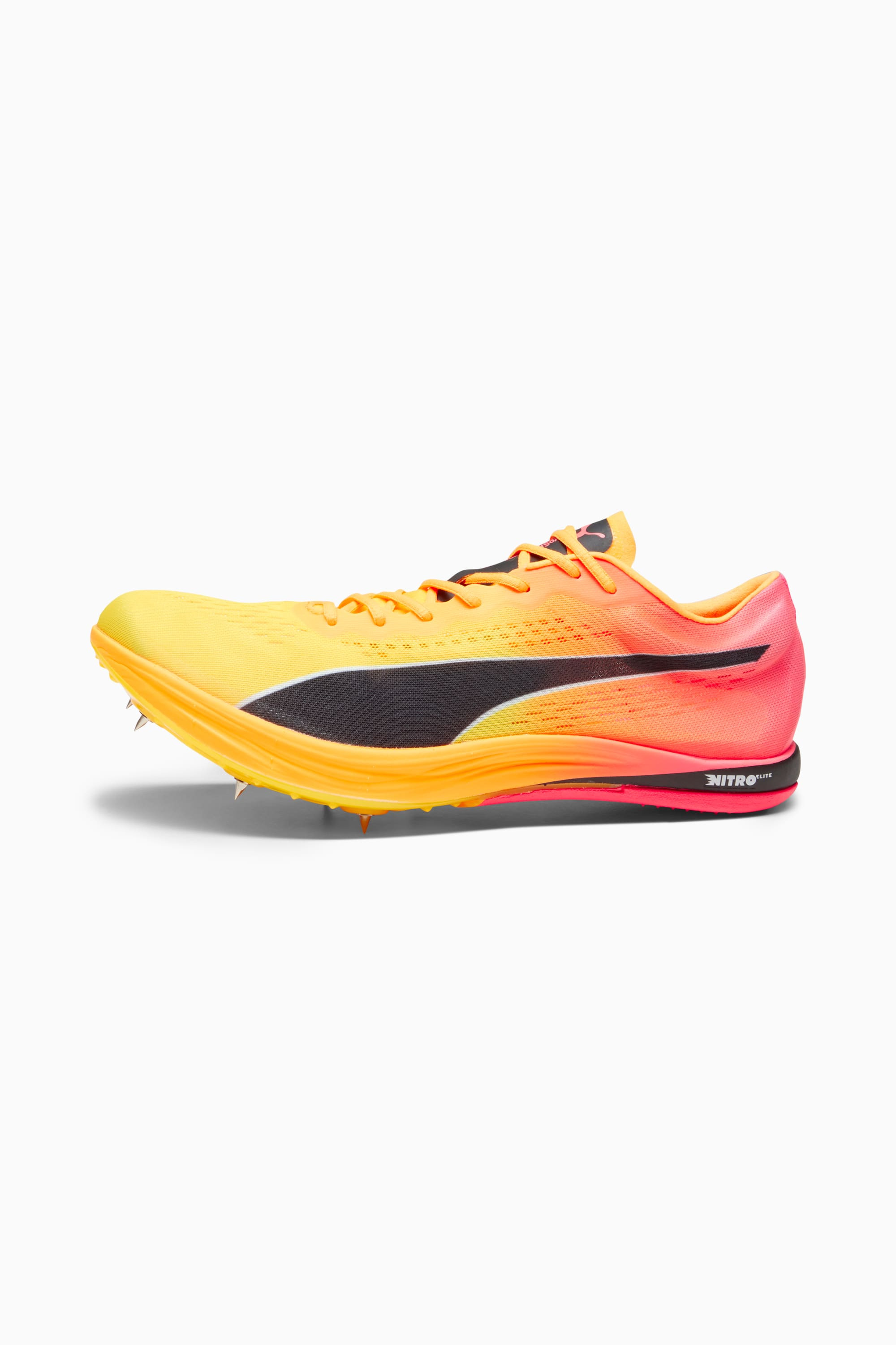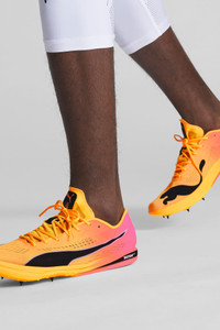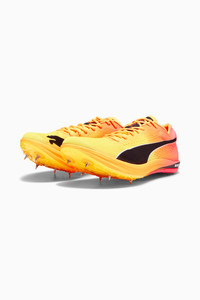 PRODUCT STORY Maximum propulsion, maximum responsiveness, and maximum speed – that’s what we’ve engineered in this evoSPEED long distance track and field spike. Built for events ranging from 800m all the way up to 10,000m, the shoe features a full-length Pebax fibre plate that’s been specially designed to stabilise the hyper-responsive, insanely lightweight, nitrogen-injected foam midsole, allowing for peak energy transfer from toe off. Providing an extra boost is the Pebax outsole spike plate, which features six removable spike pin receptacles, to provide superior grip and help maintain that high turnover needed to win your race. FEATURES & BENEFITS - NITROFOAM™ Elite: Premium performance foam technology that provides pinnacle responsiveness in an extremely lightweight package DETAILS - Style: 378222_03 - Color: Sun Stream-Sunset Glow-PUMA Black - Lightweight, ultra-breathable textile upper - Forefoot Pebax plate for grip and propulsion - 6-pin Pebax plate with removable spike pin receptacles - Heel crash pad for added durability and traction - Comes with twelve 7mm pyramid spike pins and a wrench MATERIAL INFORMATION - Midsole: 100% Synthetic - Sockliner: 100% Textile - Outsole: 100% Synthetic - Upper: 86% Textile, 14% Synthetic - Lining: 100% Textile