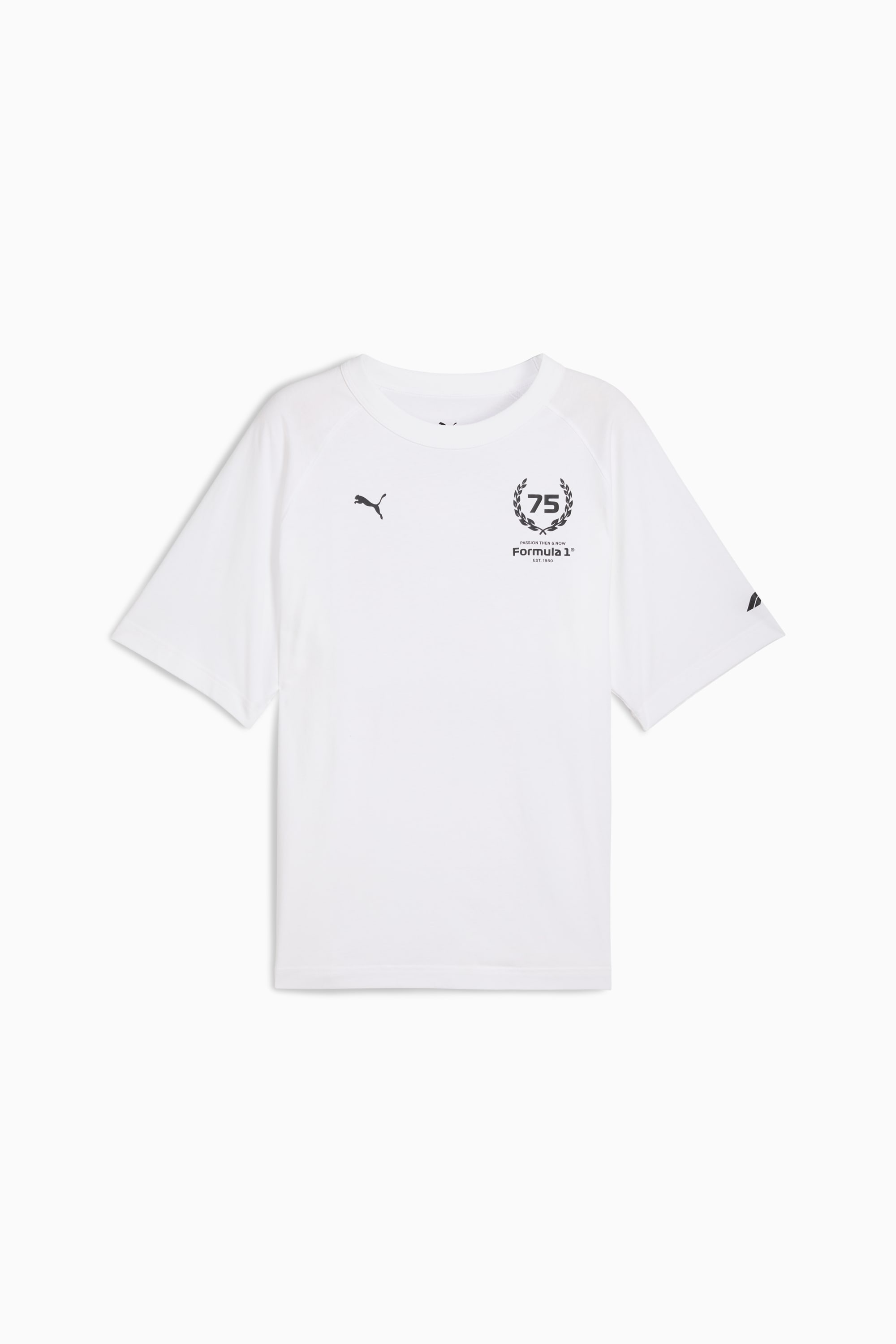 PRODUCT STORY A milestone worth the noise: Formula 1® turns 75. And because legends never slow down, PUMA and FORMULA 1® are celebrating the high-octane journey with a collection that knows how to keep up. 75 years on, faster has never looked better. Race on. FEATURES & BENEFITS - Made with at least 20% recycled cotton. DETAILS - Style: 632658_02 - Color: PUMA White - Fit: Regular - Main material type: Single jersey - Short sleeves - Crew neck - PUMA branding details MATERIAL INFORMATION - Shell: 100% cotton - Rib: 71% cotton, 29% polyester