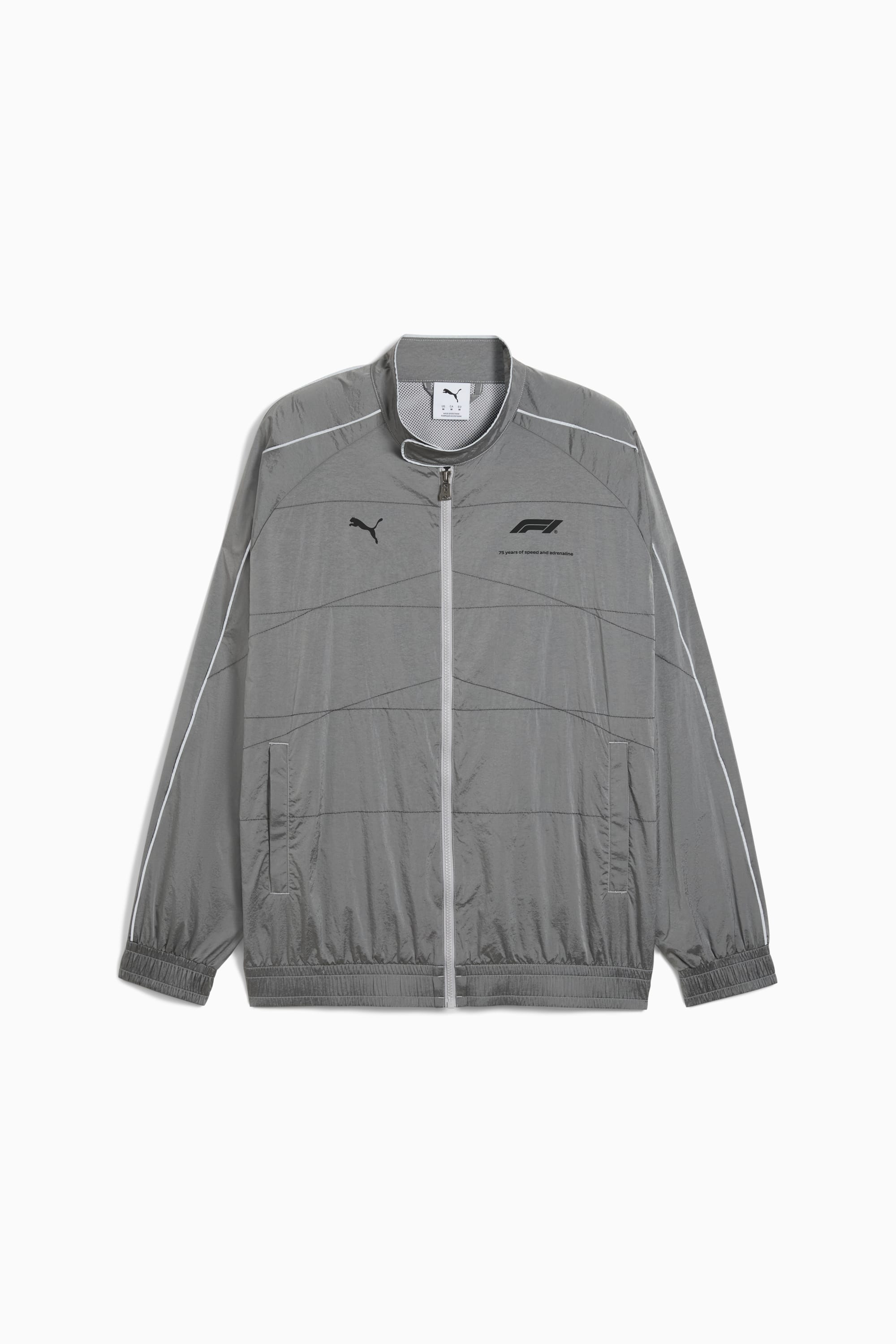 PRODUCT STORY Rev up your style with this oversized track jacket, featuring F1® and PUMA logos, a motorsport-inspired collar, and quilted stitching. With side pockets and racing attitude, it's a tribute to 75 years of speed and adrenaline. Own the moment with PUMA. FEATURES & BENEFITS - Made with at least 30% recycled materials DETAILS - Style: 630134_11 - Color: Team Silver - Relaxed fit - Plain weave - Standard jacket length - Long sleeves - Full-zip closure - PUMA branding details MATERIAL INFORMATION - Lining: 100% polyester - Shell: 100% nylon - Lower Sleeve Lining: 100% polyester