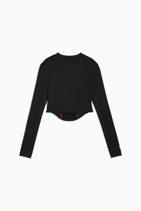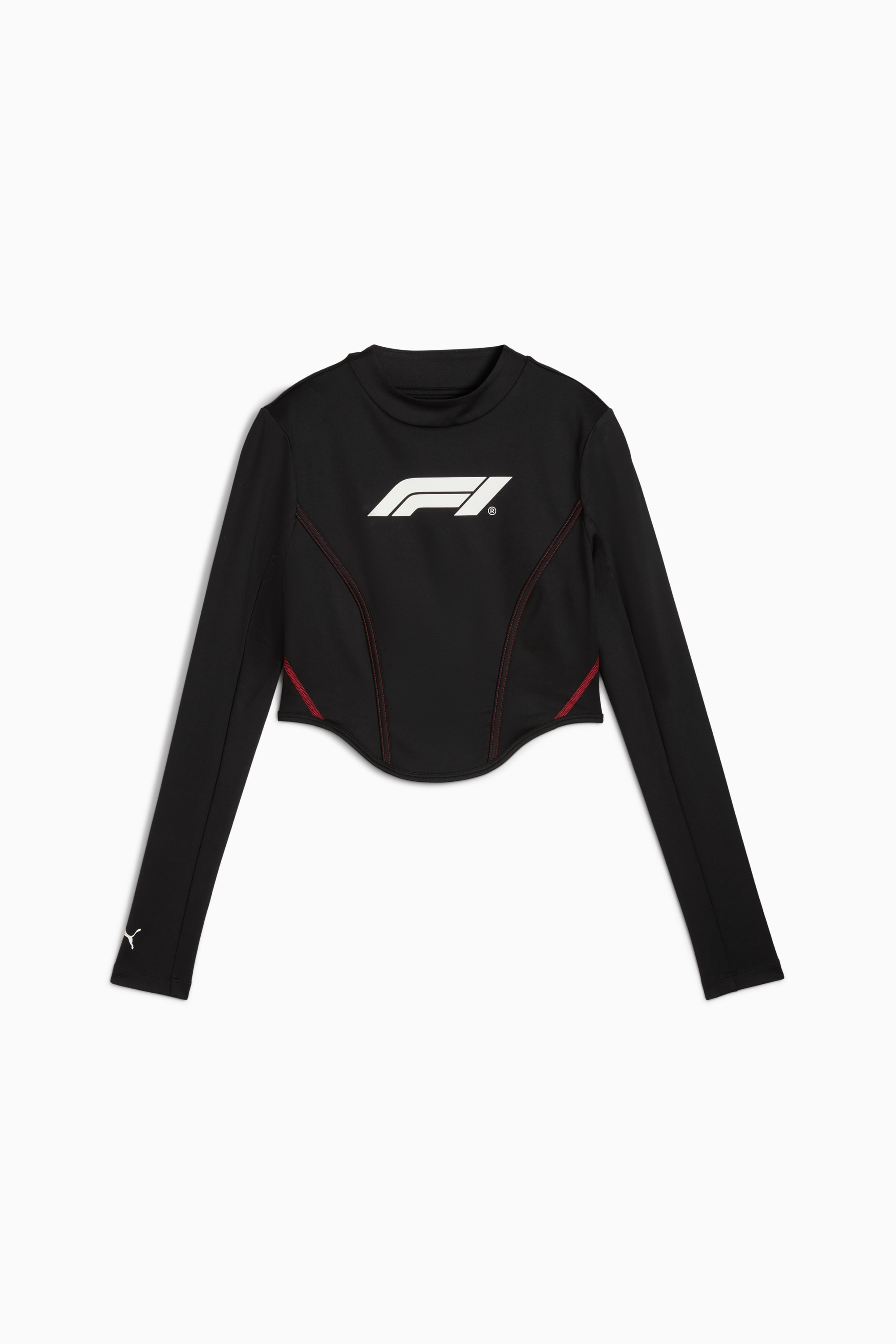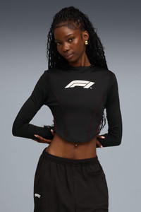PRODUCT STORY A milestone worth celebrating: Formula 1® turns 75. And because legends never stop, PUMA and FORMULA 1® are honoring the high-speed journey with a collection built to keep up. 75 years later, faster has never looked better. Keep racing. FEATURES & BENEFITS - Made with at least 50% recycled materials. - dryCELL: Performance technology designed to wick moisture from the body and keep you free of sweat during exercise DETAILS - Style: 633044_01 - Color: PUMA Black - Tight fit - Main material type: Single jersey - Long sleeves - Crew neck - Corset style top MATERIAL INFORMATION - Shell: 89% polyester, 11% elastane
