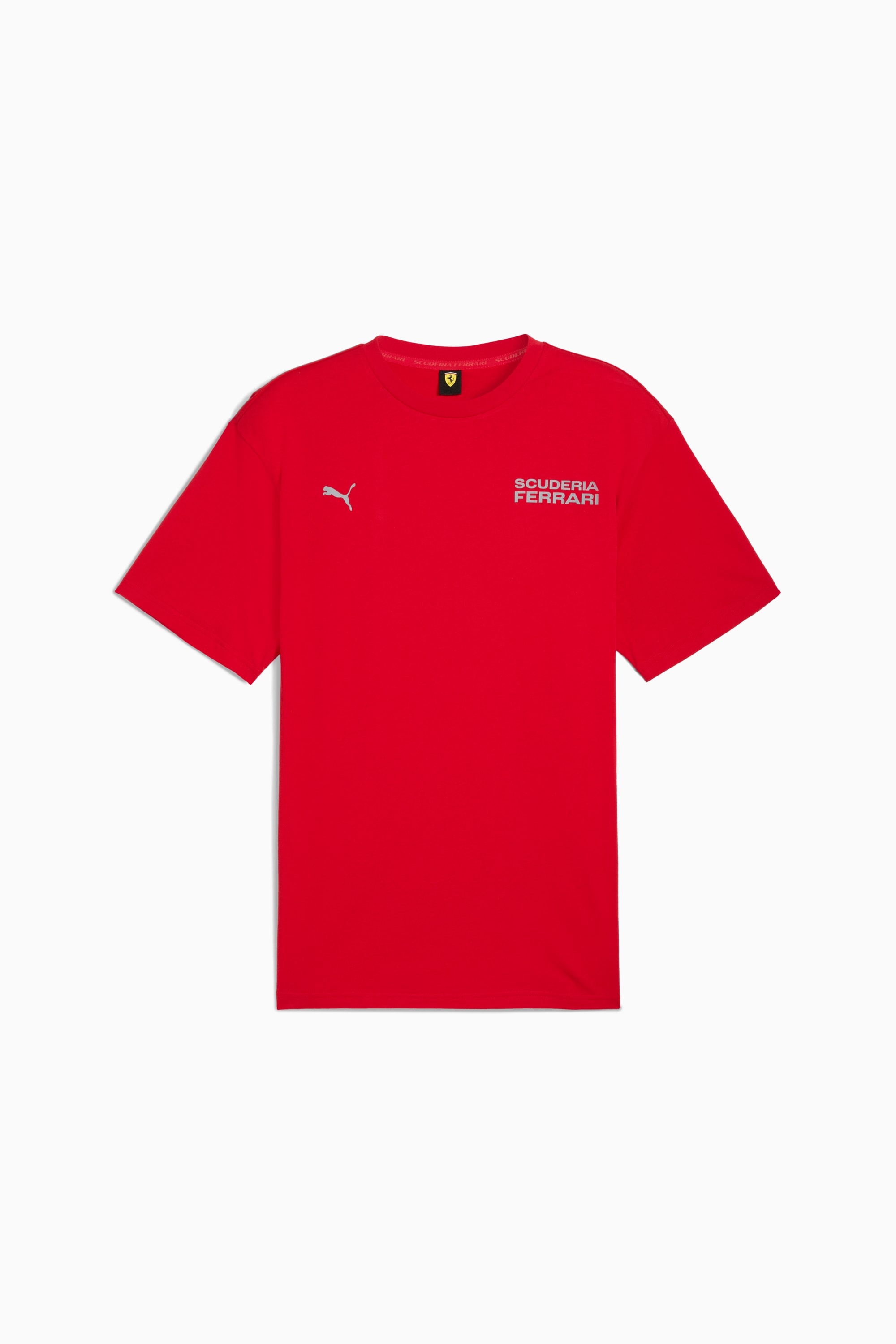 PRODUCT STORY The PUMA and Scuderia Ferrari collection celebrates motorsport excellence and Ferrari's legendary racing heritage. This line of shoes, clothing, and accessories blends style, comfort, and performance with the iconic Scuderia Ferrari colors and details, so you can embrace the Ferrari legacy wherever you go. FEATURES & BENEFITS - Made with at least 20% recycled cotton. DETAILS - Style: 632753_02 - Color: Rosso Corsa - Fit: Regular - Main material: Single jersey - Neck: Crew neck - Short sleeves - Length: Regular - Scuderia Ferrari and PUMA branding details MATERIAL INFORMATION - Shell: 100% cotton - Rib: 71% cotton, 29% polyester