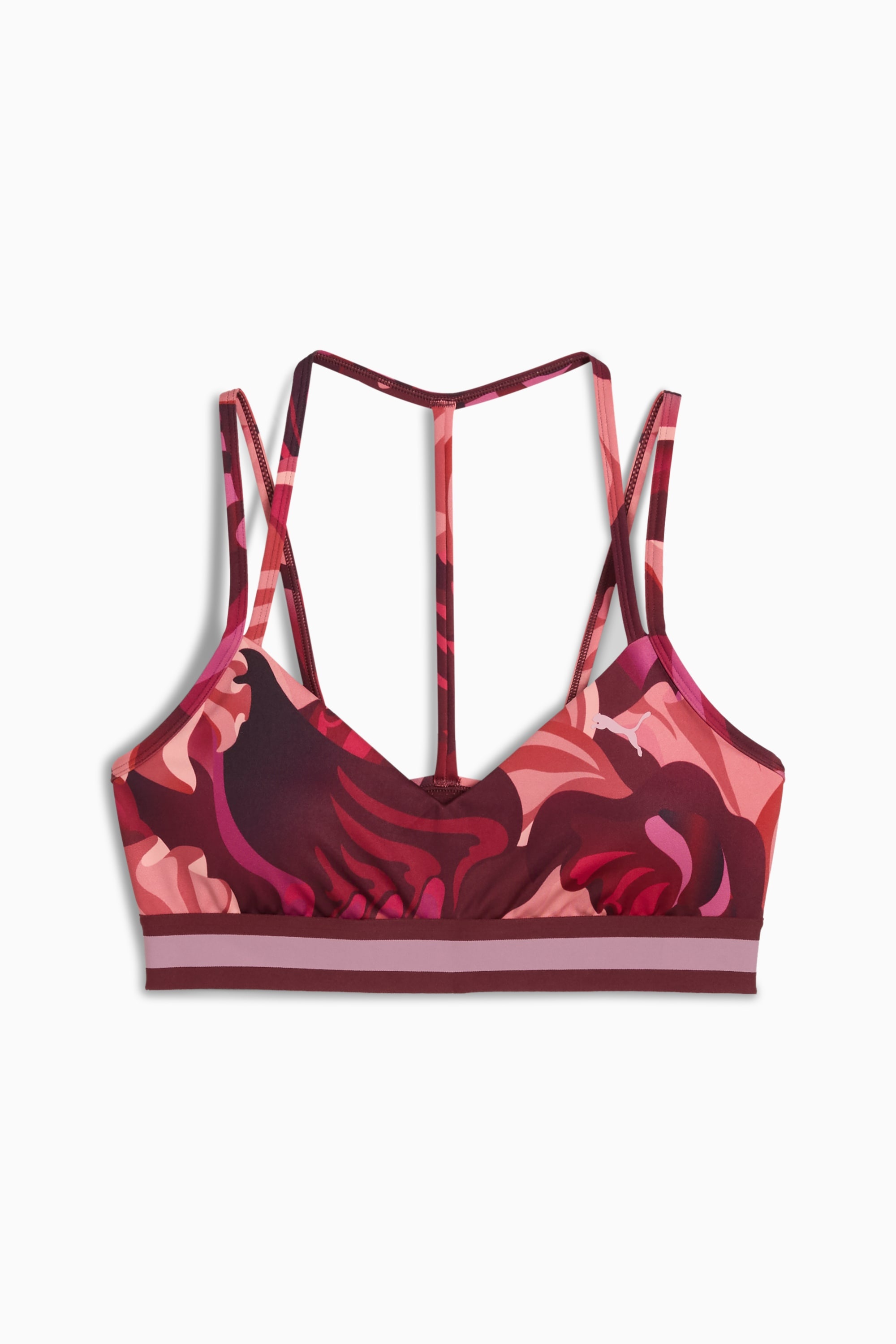 PRODUCT STORY Own your workout with fashion-forward athletic apparel. Move freely with this low-impact strappy bra, featuring dryCELL technology, removable padding, and a playful Summer Daze graphic on mesh inserts. Designed for everyday wear and light training. FEATURES & BENEFITS - dryCELL: Performance technology designed to wick moisture from the body and keep you free of sweat during exercise - Made with at least 50% recycled materials. DETAILS - Style: 527494_96 - Color: Ruby Shimmer - Fit: Tight - Main material: Interlock - Strappy back details - Removable pads - Support: recommended for low-impact workouts. MATERIAL INFORMATION - Lining: 94% polyester, 6% elastane - Shell: 85% polyester, 15% elastane - Top Waistband: 78% polyester, 11% elastane, 11% nylon