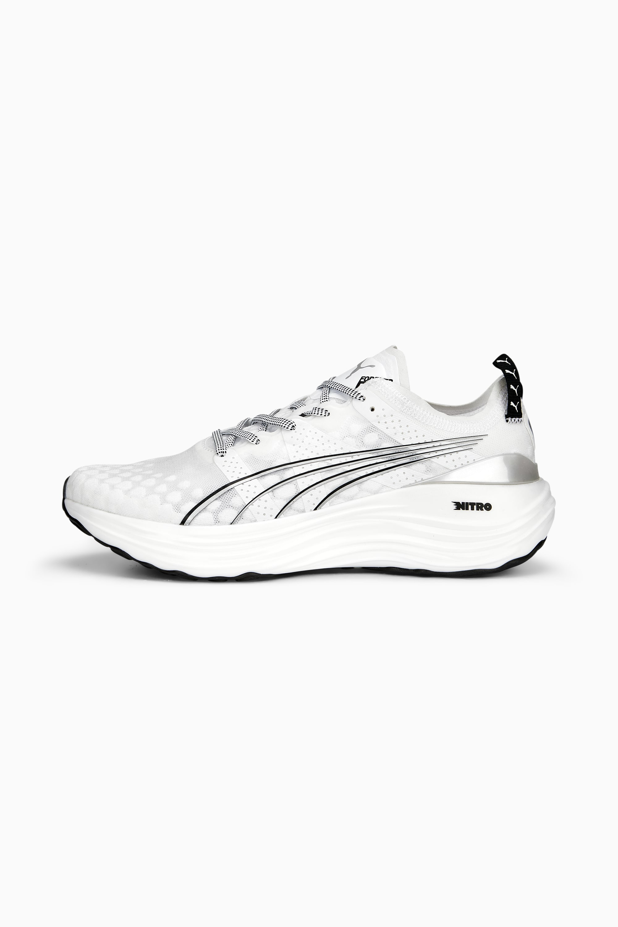 PRODUCT STORY The ForeverRUN NITRO™ dawns a new era of support and guidance for all runners, providing the softness of a full NITROFOAM™ midsole without compromising stability. It features the newly developed NITROFOAM™ midsole with two different densities – a softer core with a firmer rim – and an asymmetrical heel counter to hold the foot in place through every stride. The theme also continues on the outsole, thanks to a wider medial rubber segment stabilising late-stage pronation. In short, it's the perfect blend of support and cushion. FEATURES & BENEFITS - NITRO™: Advanced nitrogen-infused foam designed to provide superior responsiveness and cushioning in a lightweight package - PWRTAPE: Targeted upper reinforcement for support and durability - RUNGUIDE: Firm density guide rail designed to keep your foot aligned and centred through each stride - PUMAGRIP: Durable performance rubber compound designed for all-surface traction DETAILS - Style: 377757_04 - Color: PUMA White-PUMA Black - Engineered mesh upper - Asymmetrical heel counter - Flared rubber outsole - Cushioning level: Max - Heel-to-toe drop: 10mm - Best for: Overpronators - Runner type: Frequent MATERIAL INFORMATION - Midsole: 100% Synthetic - Sockliner: 100% Textile - Outsole: 100% Rubber - Upper: 63% Textile, 37% Synthetic - Lining: 100% Textile