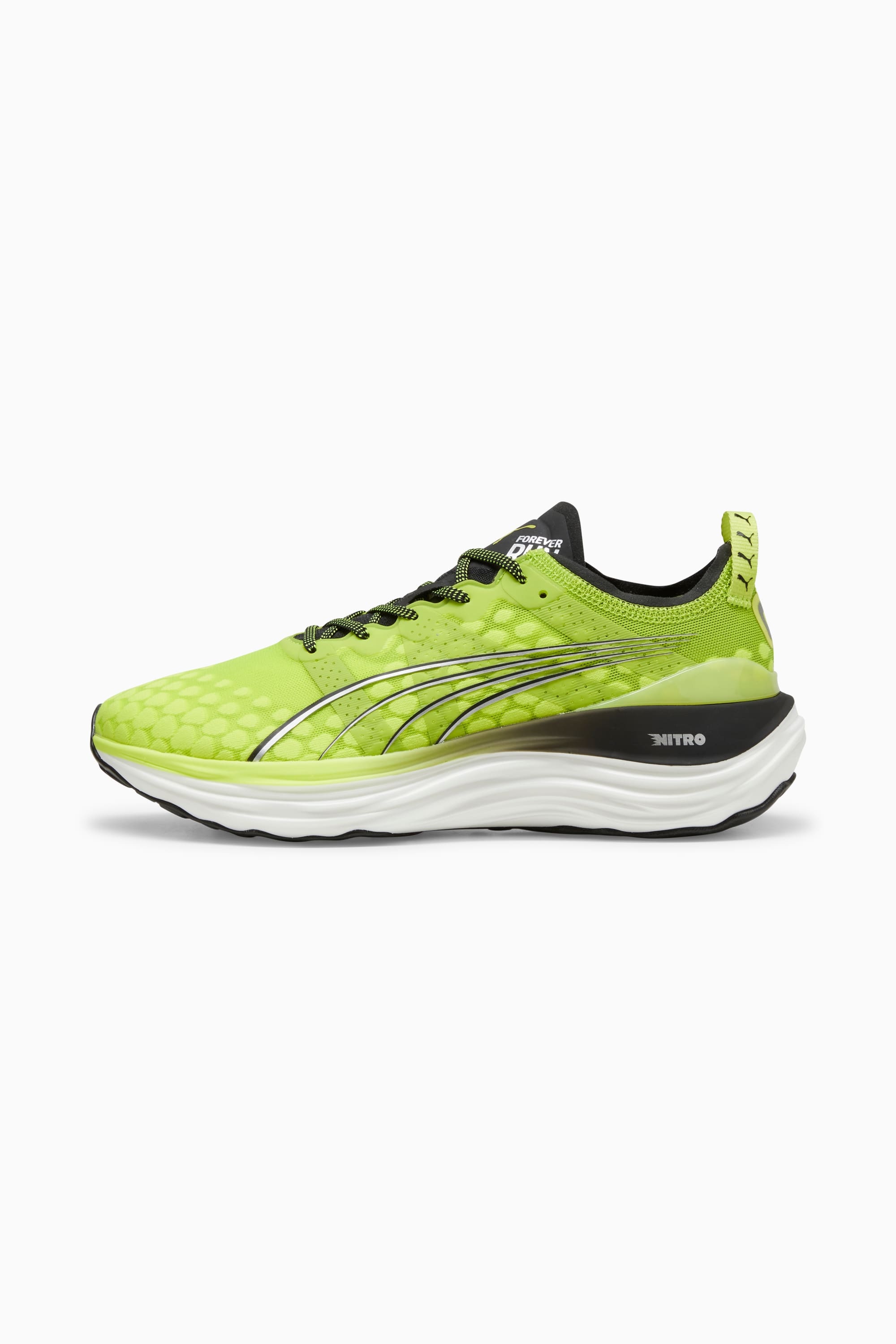 PRODUCT STORY The ForeverRUN NITRO™ dawns a new era of support and guidance for all runners, providing the softness of a full NITROFOAM™ midsole without compromising stability. It features the newly developed NITROFOAM™ midsole with two different densities – a softer core with a firmer rim – and an asymmetrical heel counter to hold the foot in place through every stride. The theme also continues on the outsole, thanks to a wider medial rubber segment stabilising late-stage pronation. In short, it's the perfect blend of support and cushion. FEATURES & BENEFITS - NITRO™: Advanced nitrogen-infused foam designed to provide superior responsiveness and cushioning in a lightweight package - PWRTAPE: Targeted upper reinforcement for support and durability - RUNGUIDE: Firm density guide rail designed to keep your foot aligned and centred through each stride - PUMAGRIP: Durable performance rubber compound designed for all-surface traction DETAILS - Style: 377757_18 - Color: Lime Pow-PUMA Black-PUMA White - Engineered mesh upper - Asymmetrical heel counter - Flared rubber outsole - Cushioning level: Max - Heel-to-toe drop: 10mm - Best for: Overpronators - Runner type: Frequent MATERIAL INFORMATION - Midsole: 100% Synthetic - Sockliner: 100% Textile - Outsole: 100% Rubber - Upper: 63% Textile, 37% Synthetic - Lining: 100% Textile