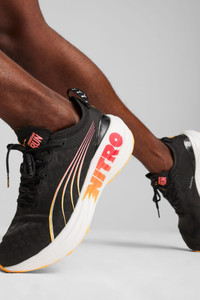 PRODUCT STORY Step into a new world of support and guidance with the ForeverRun NITRO™. Perfect for all runners and especially beginners, this shoe packs the tried-and-true RUNGUIDE system, designed to keep your feet running in the right position. We've combined a secure engineered mesh upper with an asymmetrical heel counter, to give you softness, comfort and stability. Lace up and start your running adventure with confidence. FEATURES & BENEFITS - NITRO™: Foam technology providing pinnacle responsiveness in an extremely lightweight package - RUNGUIDE System: Multiple support elements that support different foot strikes and promote proper alignment - PWRTAPE: Targeted reinforcement for upper support & durability DETAILS - Style: 309703_01 - Color: PUMA Black-Sun Stream-Sunset Glow - New engineered mesh upper - Asymmetrical heel counter for stability at impact - Lace closure - Strap at the heel for convenient storage - NITRO™ branded outsole MATERIAL INFORMATION - Midsole: 100% Synthetic - Sockliner: 100% Textile - Outsole: 100% Rubber - Upper: 63% Textile, 37% Synthetic - Lining: 100% Textile