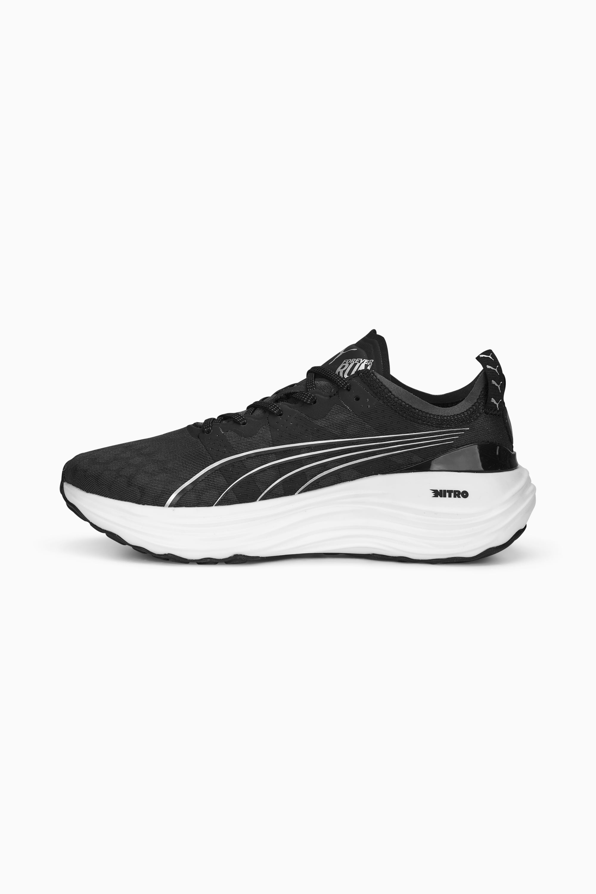 PRODUCT STORY The ForeverRUN NITRO™ dawns a new era of support and guidance for all runners, providing the softness of a full NITROFOAM™ midsole without compromising stability. It features the newly developed NITROFOAM™ midsole with two different densities – a softer core with a firmer rim – and an asymmetrical heel counter to hold the foot in place through every stride. The theme also continues on the outsole, thanks to a wider medial rubber segment stabilising late-stage pronation. In short, it's the perfect blend of support and cushion. FEATURES & BENEFITS - NITRO™: Advanced nitrogen-infused foam designed to provide superior responsiveness and cushioning in a lightweight package - PWRTAPE: Targeted upper reinforcement for support and durability - RUNGUIDE: Firm density guide rail designed to keep your foot aligned and centred through each stride - PUMAGRIP: Durable performance rubber compound designed for all-surface traction DETAILS - Style: 377758_01 - Color: PUMA Black-PUMA White - Engineered mesh upper - Asymmetrical heel counter - Flared rubber outsole - Cushioning level: Medium - Heel-to-toe drop: 10mm - Best for: Overpronators - Runner type: Frequent MATERIAL INFORMATION - Midsole: 100% Synthetic - Sockliner: 100% Textile - Outsole: 100% Rubber - Upper: 63% Textile, 37% Synthetic - Lining: 100% Textile