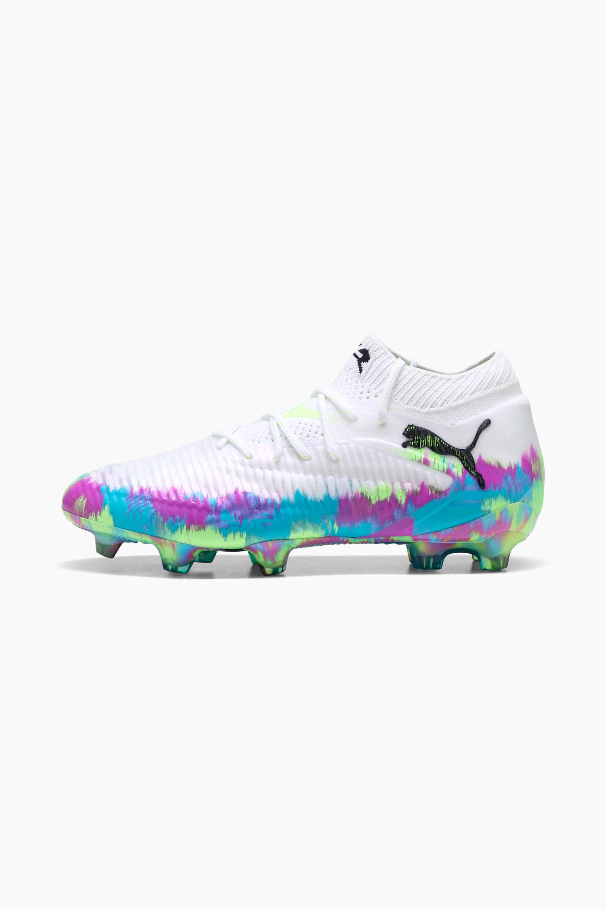 PRODUCT STORY Playmakers, unleash your creativity with FUTURE. In the upper, FUZIONFIT³ wraps the foot like a second skin, offering a snug, cushioned fit without limiting movement. And when you want to showcase your skill with the ball, a textured high-density mesh layer with a GripControl Pro finish adds grip and control. With the all-new FLEXGILITY outsole for 360-degree agility, you can move between the lines and create without limits. FEATURES & BENEFITS - Made with at least 20% recycled materials in the upper - SKILL: Textured high-density mesh layer with a GripControl Pro finish for all the ball grip and control you need to create chances or finish them off with ease - FIT: PWRTAPE across the midfoot for the ultimate lockdown and stability. The new triangular shape improves stretchiness and adaptability - MADE FOR HER: This football boot is made for women, with measurements such as volume and instep height engineered for the female foot. DETAILS - Style: 108768_01 - Color: PUMA White-Fizzy Apple-Bright Aqua-Pure Magenta - Lightweight removable sockliner with NanoGrip technology - Play with or without laces - MOVEMENT: With its circular stud layout and dual-density composition, the FLEXGILITY outsole is designed for quick pivots and agile 360-degree movement needed to outmaneuver the opposition - Regular to wide fit - FG: Suitable for use on firm natural surfaces MATERIAL INFORMATION - Sockliner: 100% Textile - Outsole: 100% Synthetic - Upper: 81.27% Synthetic, 18.73% Textile - Lining: 62.59% Textile, 37.41% Synthetic