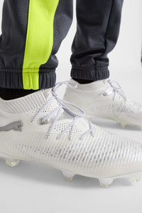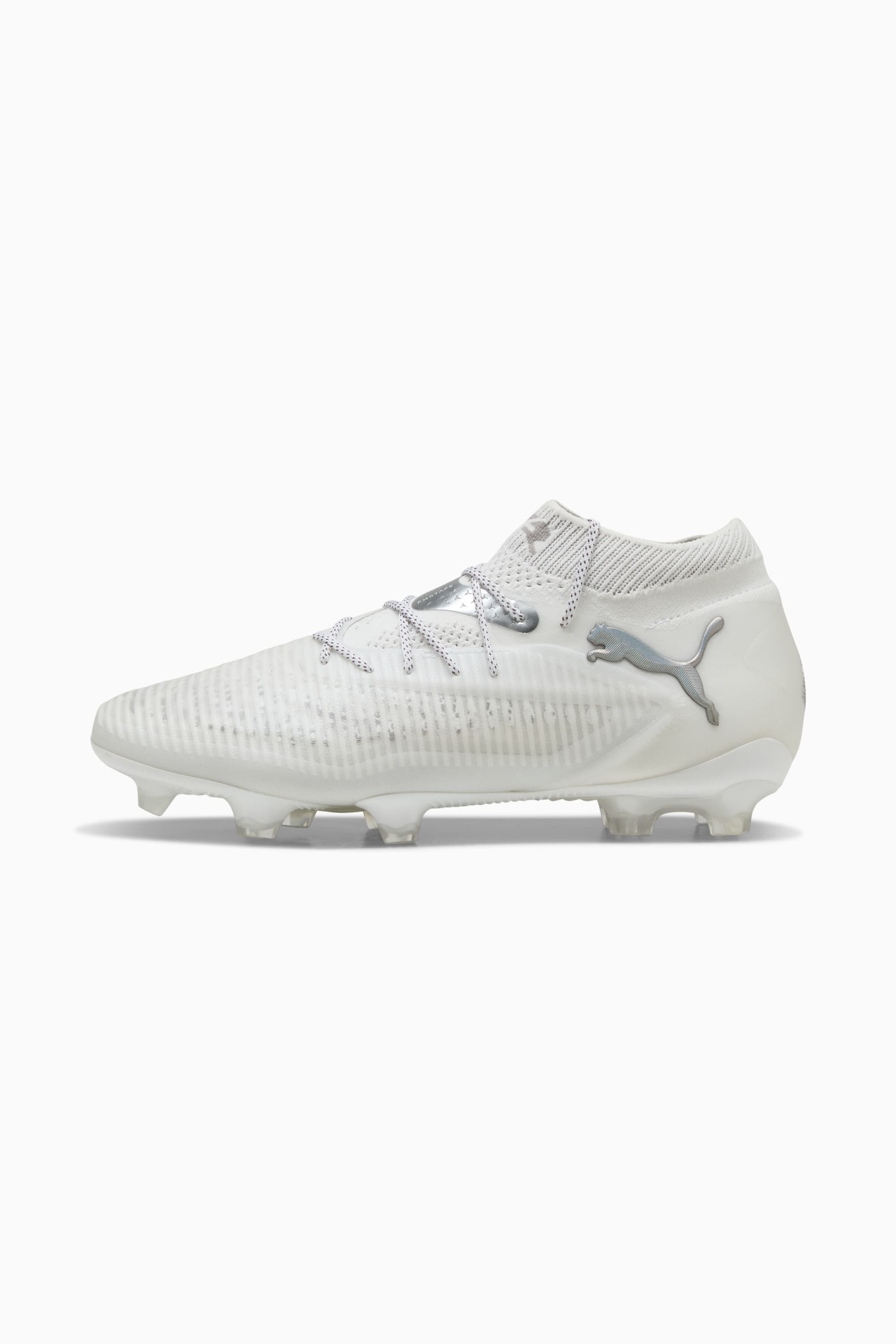 PRODUCT STORY Playmakers, unleash your creativity on firm soccer ground with the FUTURE 8 ULTIMATE. These game-changing cleats feature a high-density mesh for ball control, FLEXGILITY outsole for agile movement, and the option to play with or without laces, so you can move between the lines and create beyond limits. PUMA's ultimate fit and performance await. FEATURES & BENEFITS - Made with at least 20% recycled materials in the upper - PWRTAPE: Targeted upper reinforcement for support and durability - FUZIONFIT: wraps the foot like a second skin, offering a snug, cushioned fit without limiting movement DETAILS - Style: 108138_04 - Color: PUMA White-Matte Silver - Textured high-density mesh with GripControl Pro finish - PWRTAPE across the midfoot provides ultimate lockdown and stability for enhanced control - Regular to wide fit - FLEXGILITY outsole is designed for quick pivots and agile 360-degree movement needed to outmaneuver the opposition - FG: Suitable for use on firm natural surfaces MATERIAL INFORMATION - Sockliner: 100% Textile - Outsole: 100% Synthetic - Upper: 82.67% Synthetic, 17.33% Textile - Lining: 62.59% Textile, 37.41% Synthetic