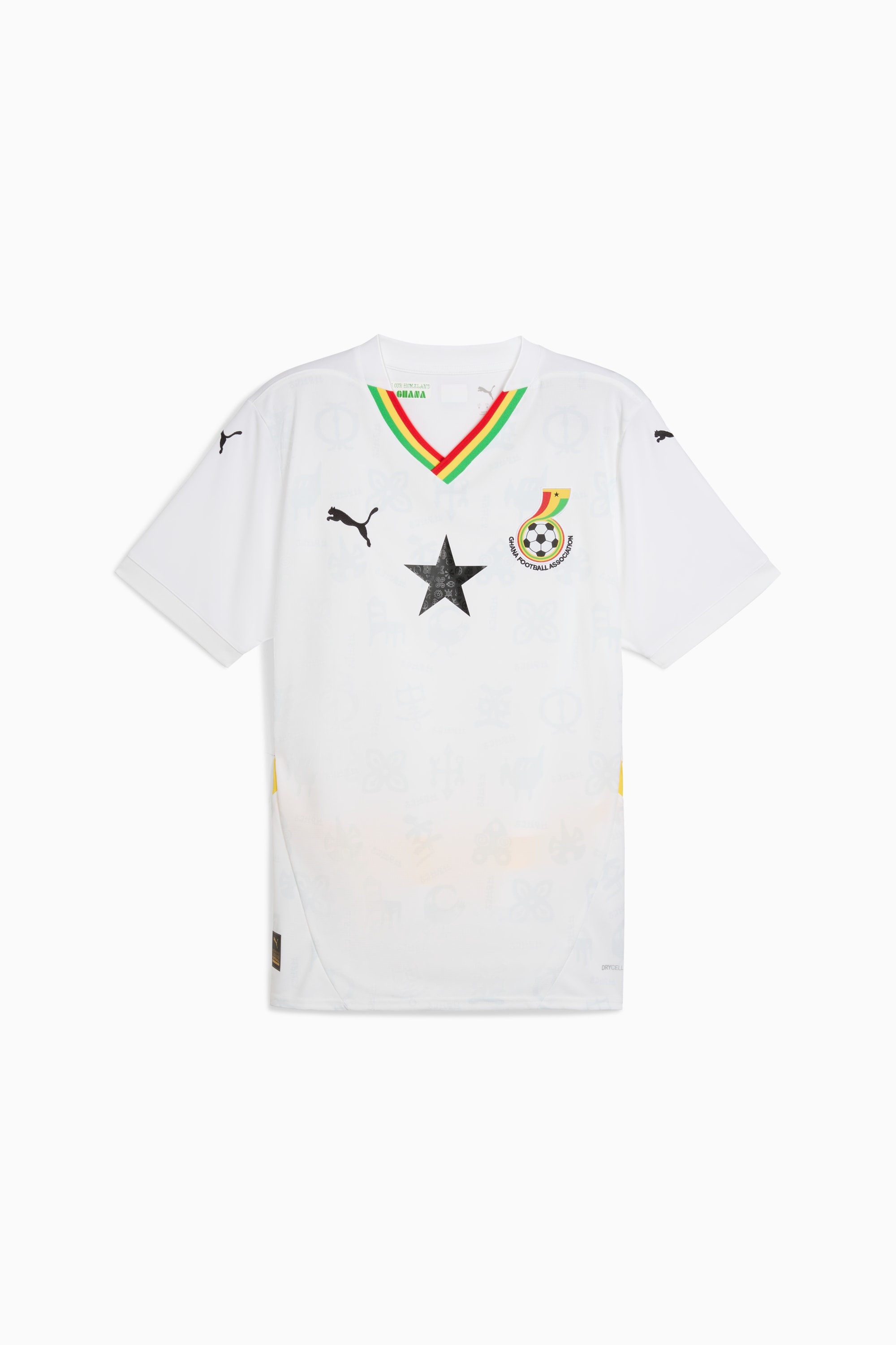 PRODUCT STORY Show your pride for the Black Stars with the Ghana Home Kit. Traditional Adinkra symbols create a distinctive all-over pattern, honoring the richness of Ghana's cultural heritage. The Black Star at the center adds the perfect finishing touch. FEATURES & BENEFITS - As part of the RE:FIBRE program, this garment is made of at least 95% recycled material from textile waste and other used materials - dryCELL: Performance technology designed to wick moisture from the body and keep you free of sweat during exercise DETAILS - Style: 777192_01 - Color: PUMA White-Pele Yellow - Regular fit - Short sleeves - Regular length - Ghana badge - PUMA branding details MATERIAL INFORMATION - Shell: 100% polyester - Collar: 97% polyester, 3% elastane - Rib: 100% polyester