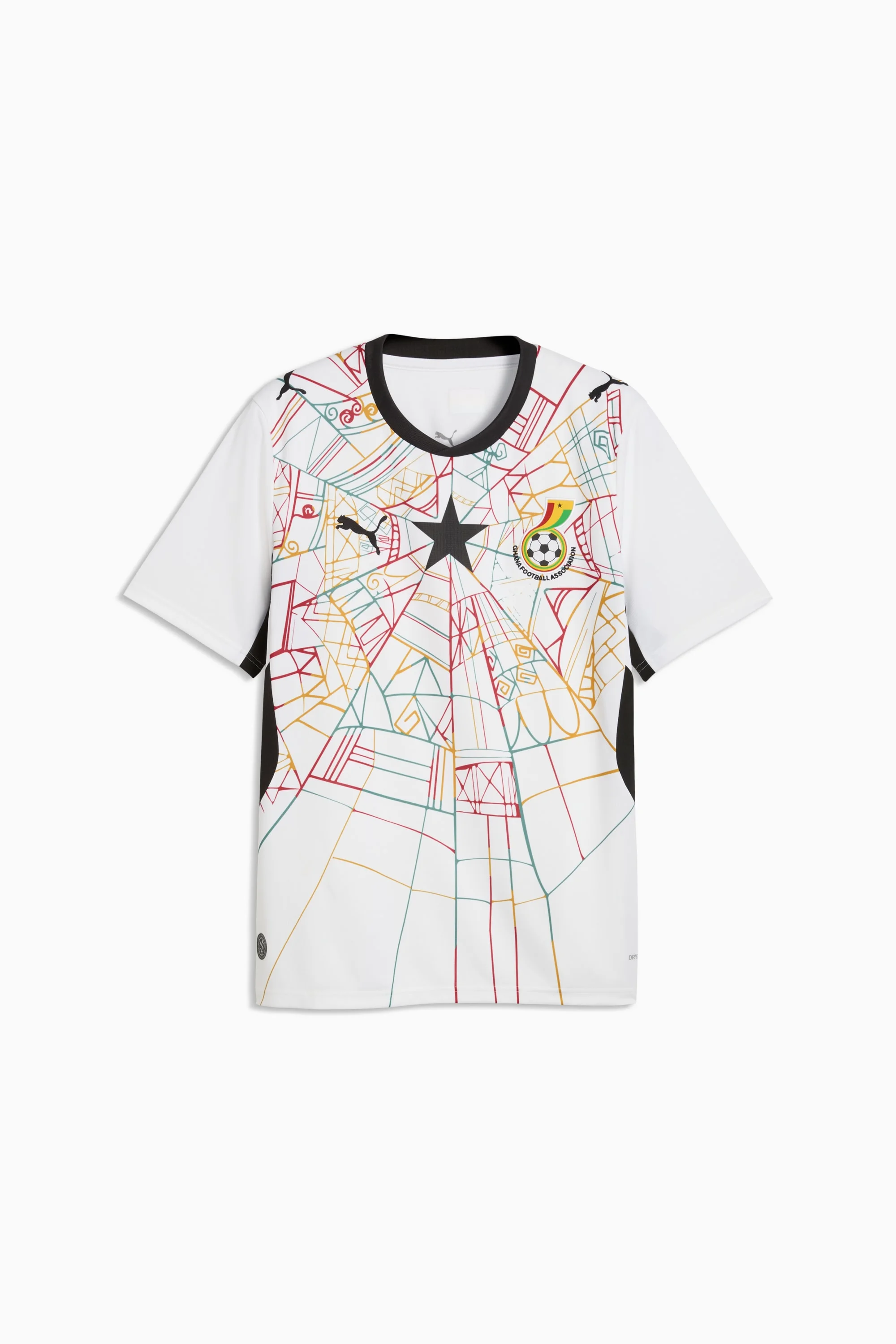 PRODUCT STORY Football and folklore come together in Ghana’s Home Kit. With a bold graphic drawn from the legends surrounding Kente – the country’s iconic woven cloth – it brings a sense of heritage into the modern game. The Replica jersey pairs the same match-worn look with a casual silhouette, details, and materials, ideal for both game day and everyday wear. FEATURES & BENEFITS - MOISTURE MANAGEMENT: Technical dryCELL fabrics wick moisture away from the skin to help keep you dry and comfortable - As part of the RE:FIBRE program, this garment is made of at least 95% recycled material from textile waste and other used materials. DETAILS - Style: 783419_01 - Color: PUMA White-PUMA Black - Fit: Regular - Main material type: Double-face jacquard - Neck: Crew neck - Short sleeves - Team and PUMA branding details - Mesh panels for ventilation