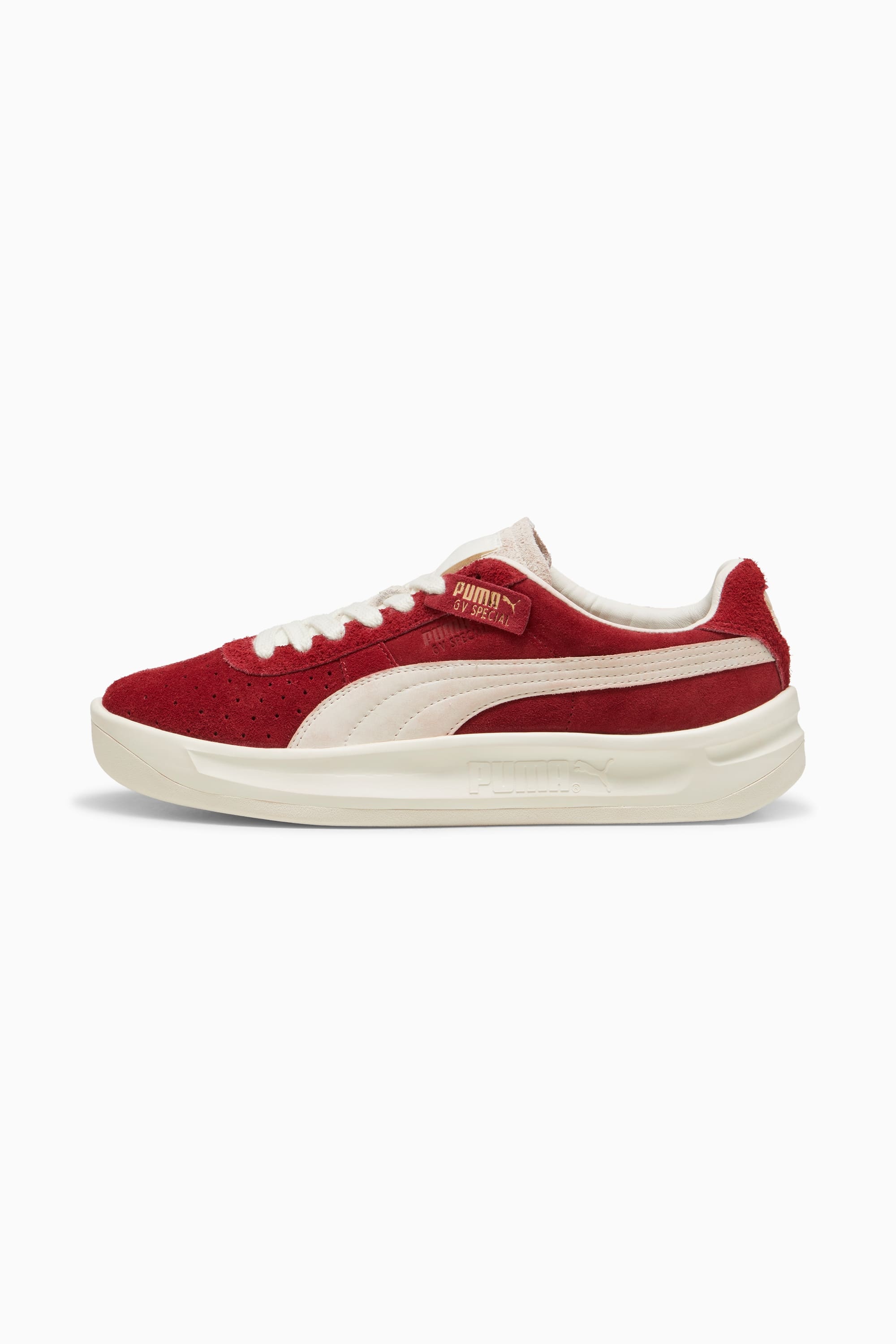 PRODUCT STORY Back in the '70s, Argentinian tennis player Guillermo Vilas smashed through winning streaks. In the '80s we created his signature shoe, the GV Special, which pays tribute to its namesake with a court-meets-street aesthetic that's iconic to this day. With perforated detailing for breathability, plus a chunky sole, this version features a suede upper for a timeless look. FEATURES & BENEFITS - PUMA's leather products support responsible manufacturing via the Leather Working Group. www.leatherworkinggroup.com DETAILS - Style: 398508_02 - Color: Intense Red-Frosted Ivory - Leather upper - Hairy suede heel overlay, eyestay and tongue - Breathable synthetic collar and tongue lining - Synthetic sockliner - Nubuck PUMA Formstrip - PUMA and GV Special branding details MATERIAL INFORMATION - Sockliner: 100% Synthetic - Outsole: 100% Rubber - Upper: 100% Leather - cow - Lining: 60% Textile, 40% Synthetic