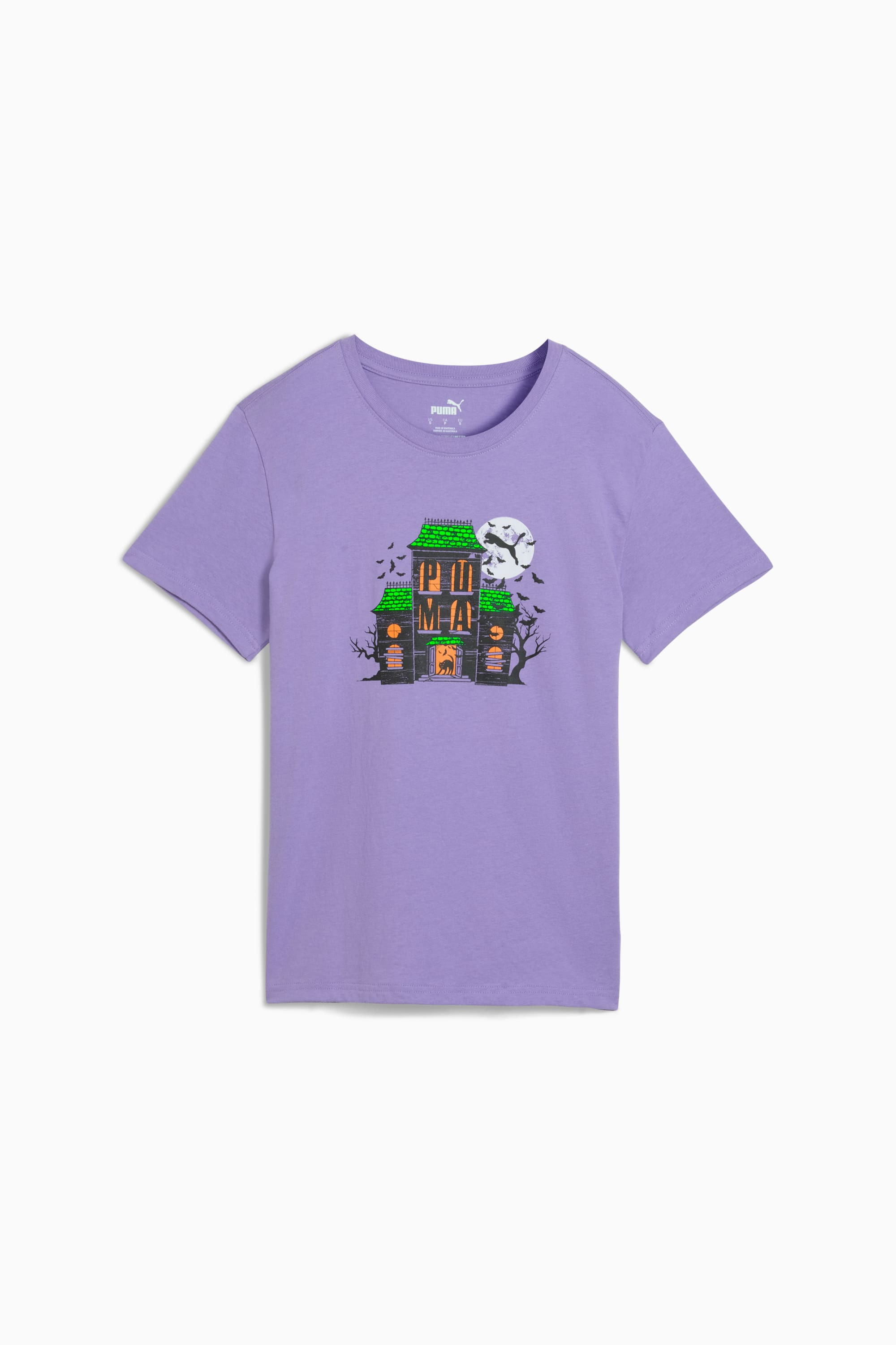 PRODUCT STORY Own the spooky season in this regular-fit tee made from soft cotton. Perfect for late-night chills or daytime fun, it pairs easily with jeans or joggers. Add a playful touch to your wardrobe and let PUMA bring the Halloween spirit. DETAILS - Style: 693033_28 - Color: Lavender Alert - Fit: Comfort - Main Material: Single jersey - Fabric: Knitted - Neck: Crew neck - Short sleeves - Length: Regular