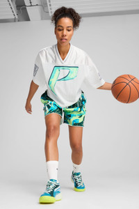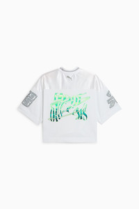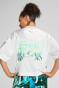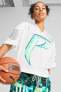 PRODUCT STORY This cropped basketball-inspired jersey has colorful graphics and bold PUMA basketball branding. Designed for those who love to stand out it's perfect for showing off your love for the game. FEATURES & BENEFITS - Made with 100% recycled material excluding trims & decorations. DETAILS - Style: 630511_01 - Color: PUMA White - Oversized fit - Main material: Mesh - Cropped length - V-neck - Short sleeves - High rise MATERIAL INFORMATION - Shell: 100% polyester - SLEEVE: 100% polyester - SHOULDER: 100% polyester