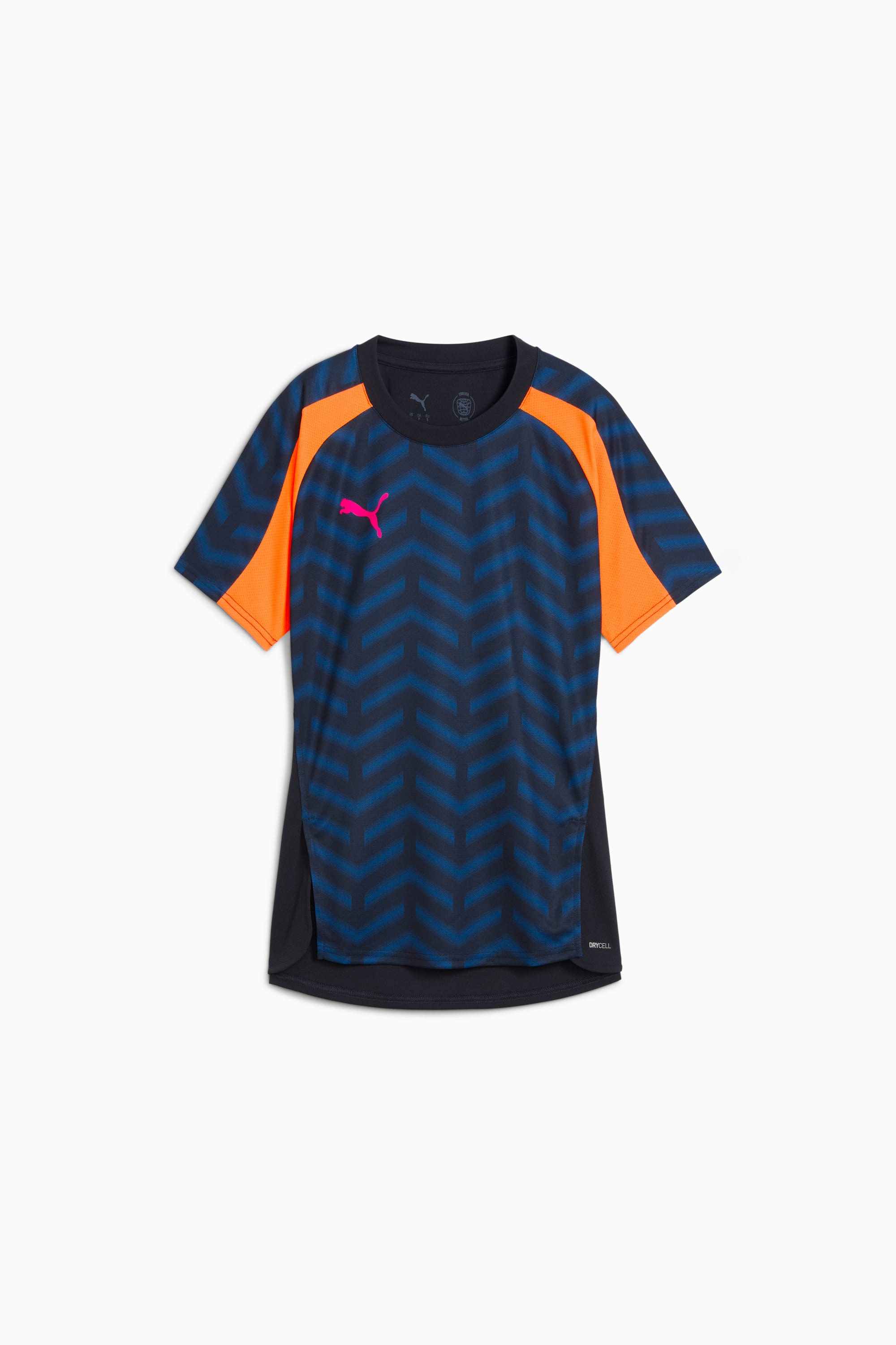PRODUCT STORY It's time to dominate the field with this bold jersey. Powered by dryCELL technology to keep you cool and focused, it features tonal mesh inserts for breathability and a striking all-over graphic design. Perfect for practice or game day, it's classic PUMA energy for players who demand performance with personality. FEATURES & BENEFITS - dryCELL: Highly functional materials draw sweat away from your skin and help keep you dry and comfortable during exercise - As part of the RE:FIBRE program, this garment is made of at least 95% recycled material from textile waste and other used materials DETAILS - Style: 660262_04 - Color: New Navy-Heat Fire-Ravish - Fit: Regular - Main material: Double face jacquard - Neck: Crew neck - Short sleeves - Length: Regular - PUMA branding details MATERIAL INFORMATION - Inserts: 100% polyester - Shell: 100% polyester