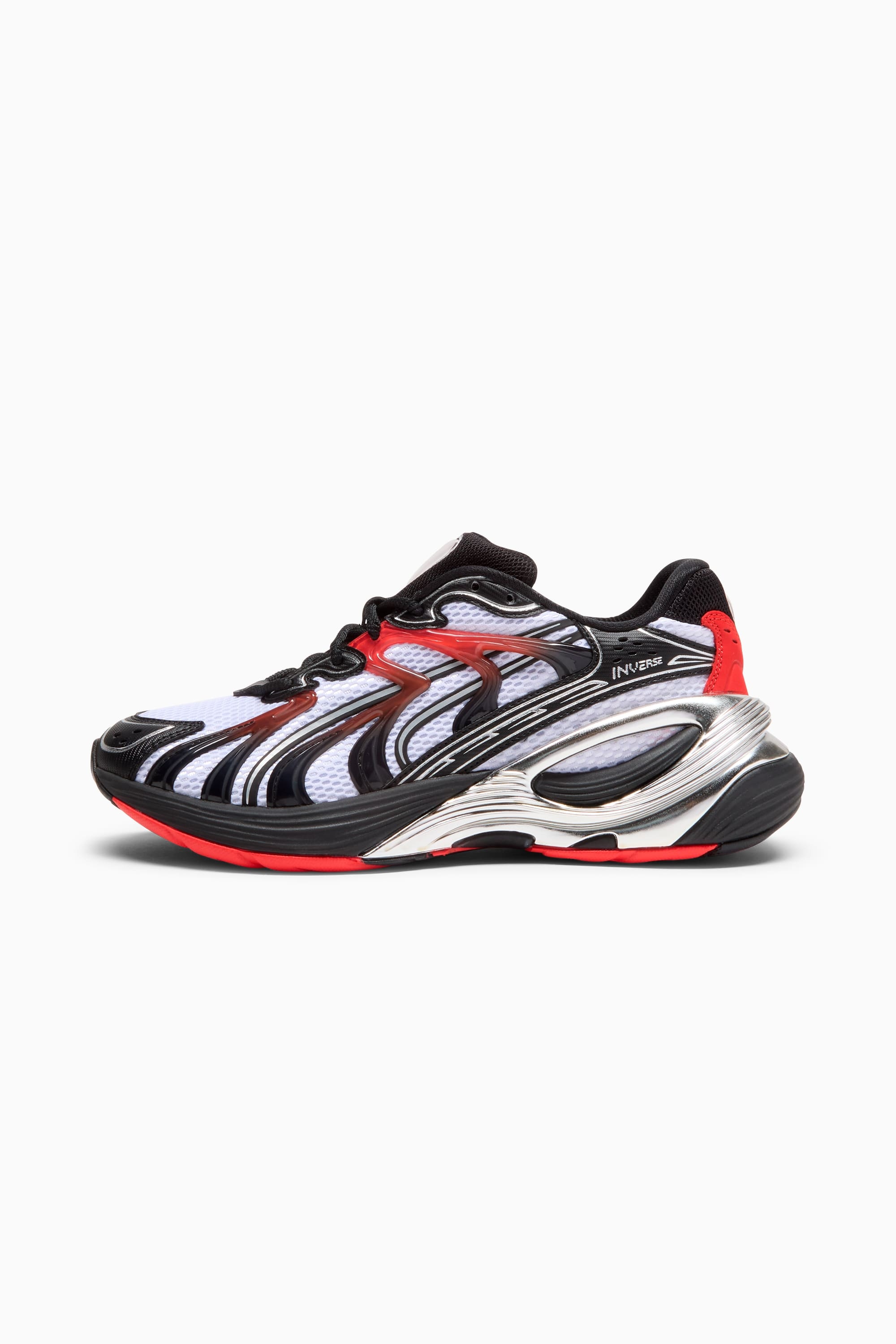 PRODUCT STORY Say hello to the Inverse, our most progressive silhouette yet. Inverse pushes the boundaries of art and science. To create Inverse, our designers looked to AI technology to remix and reshape a new silhouette inspired by our Inhale sneakers. The result is a never-before-seen design that challenges the norm. Expressive lines, mixed materials, and asymmetrical shapes come together in this new step into the future. DETAILS - Style: 404928_01 - Color: PUMA White-PUMA Black-For All Time Red - Width: Regular - Toe Type: Rounded - Fastener: Laces - Heel type: Flat - Lining: Textile - Outsole: Rubber MATERIAL INFORMATION - Midsole: 100% Synthetic - Sockliner: 100% Textile - Outsole: 100% Rubber - Upper: 58.76% Synthetic, 36.50% Textile, 4.74% Leather - cow - Lining: 100% Textile