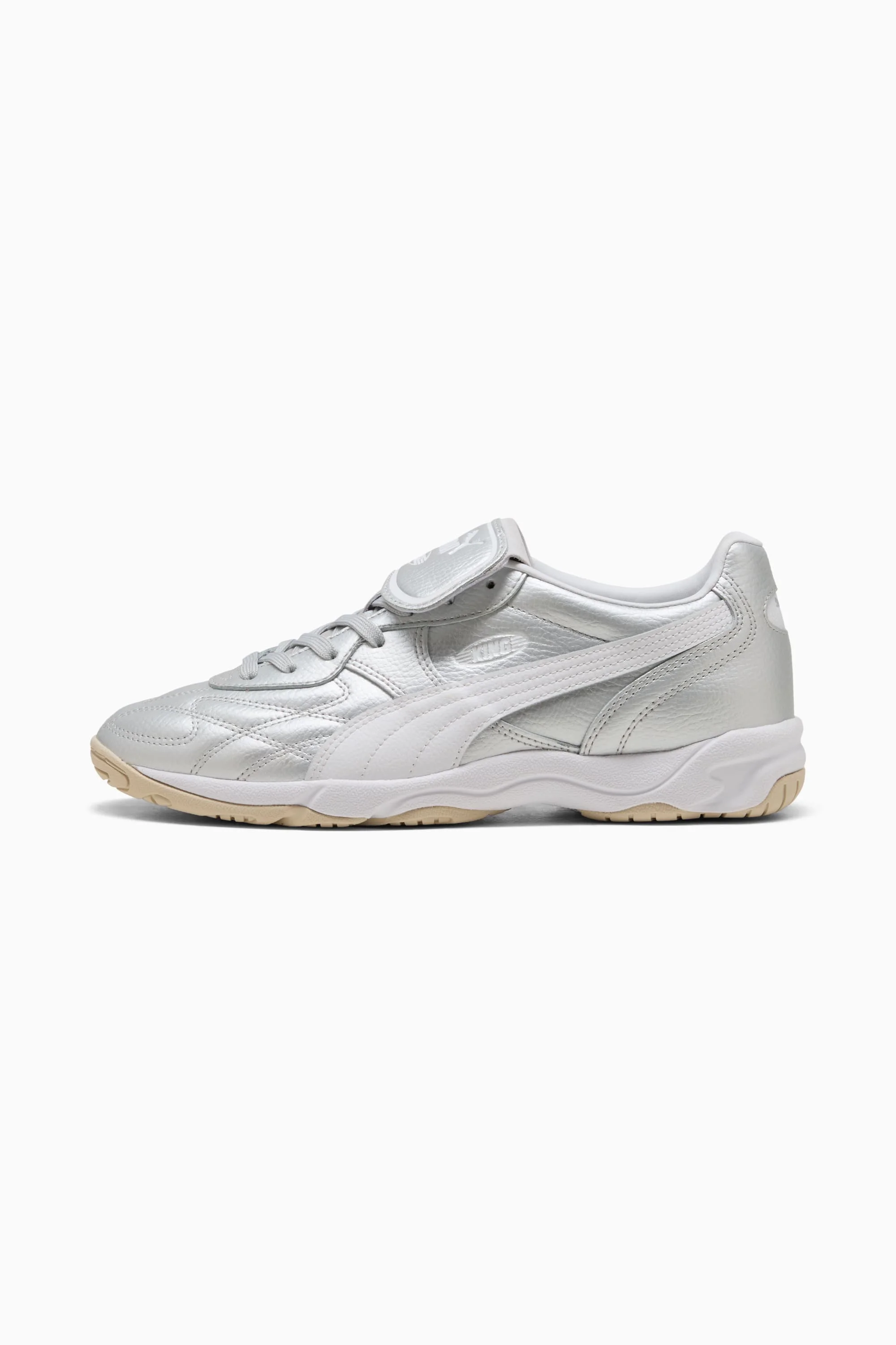 PRODUCT STORY We’re taking it back with our football icon: The King Indoor. In the early ‘00s, this shoe represented youth style culture and today we’re bringing it back to inspire the next generation. These indoor football shoes are a style star on and off the pitch. DETAILS - Style: 404629_01 - Color: Silver Mist-Alpine Snow - Width: Regular - Toe type: Rounded - Closure: Laces - Heel type: Flat - Removable tongue flap - PUMA branding details MATERIAL INFORMATION - Midsole: 100% Synthetic - Sockliner: 100% Synthetic - Outsole: 100% Rubber - Upper: 100% Leather - cow - Lining: 70.08% Textile, 29.92% Synthetic