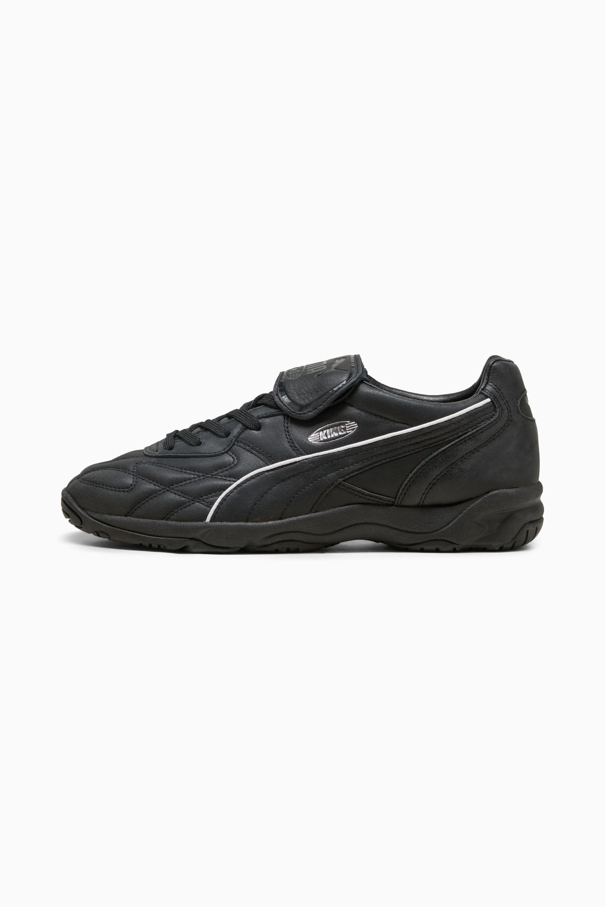 PRODUCT STORY We're bringing back a football icon: The King Indoor. In the early 2000s, this shoe represented youth style culture, and now we're reintroducing it to inspire the next generation. This indoor soccer shoe goes beyond the game and has become a style icon both on and off the field. The King Indoor features a full leather upper, the iconic logo, and a tongue cover, perfect for the stands or the field. DETAILS - Style: 404363_02 - Color: PUMA Black-PUMA White - Width: Regular - Toe Type: Rounded - Fastener: Laces - Heel type: Flat - Removable tongue flap - PUMA and KING branding details