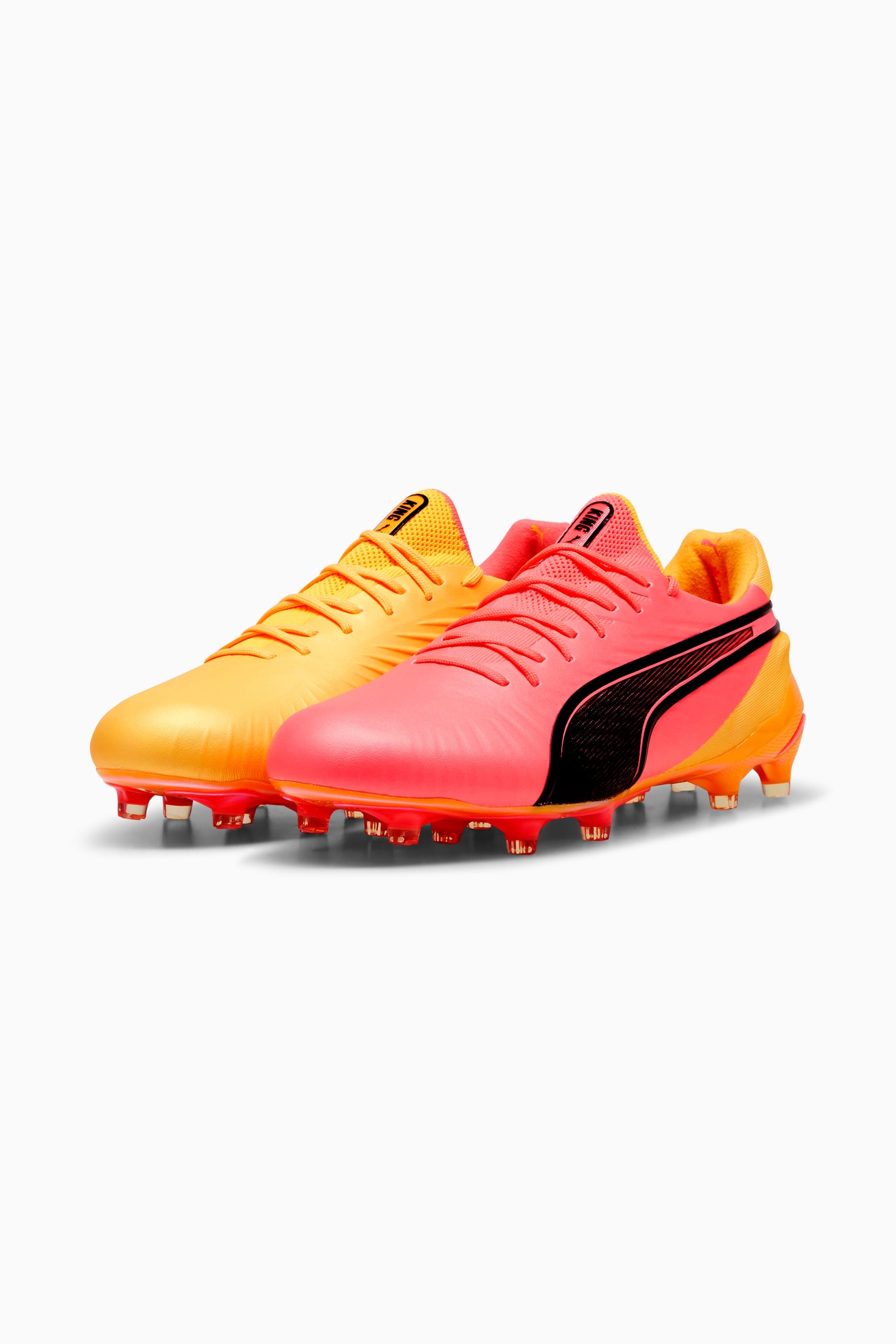 PRODUCT STORY Let everyone know: there's a new KING in town. This soccer cleat lives up to its name with the combination of non-animal-based K-BETTER™ upper material and GripControl 3D structure on the medial side for enhanced ball control and a touch that's fit for a KING. This version is part of the new Tricks Pack featuring statement-making different colored boots. FEATURES & BENEFITS - K-BETTER™: Better without leather. Non-animal-based K-BETTER™ upper material for a new and improved take on the signature KING touch, comfort, and durability - GripControl 3D: ribbed structure for enhanced ball control DETAILS - Style: 108068_01 - Color: Sun Stream-PUMA Black-Sunset Glow - Lightweight removable sockliner with NanoGrip technology keeps the foot from slipping inside the boot - OrthoLite® memory foam padding in the heel for improved comfort - Lightweight outsole with external heel counter, integrated stability spine, and conical studs for maximum manoeuvrability - Regular fit - Knitted, low-cut slip-on construction ensures a comfortable fit - FG/AG: Firm Ground/Artificial Ground MATERIAL INFORMATION - Sockliner: 100% Textile - Outsole: 100% Synthetic - Upper: 84.52% Synthetic, 15.48% Textile - Lining: 100% Synthetic