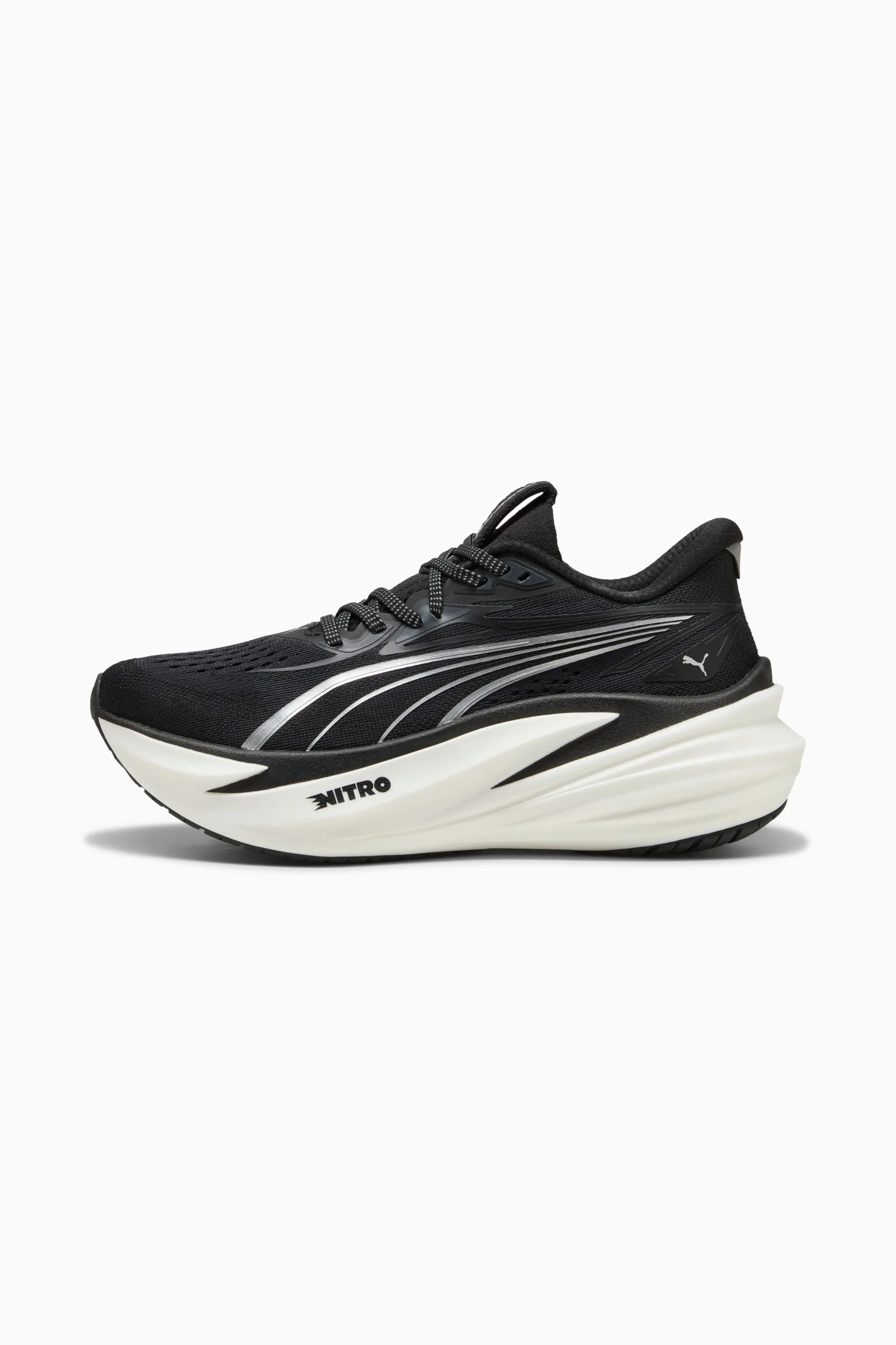 PRODUCT STORY Feel the bounce with the MagMax NITRO™ 2. Packed with the highest stack of NITROFOAM™ cushioning, it delivers an ultra-plush ride that energises every step. The engineered mesh upper keeps things cool and secure, while the PUMAGRIP outsole provides steady traction. Mile after mile, these shoes bring effortless comfort and performance. FEATURES & BENEFITS - The upper of the shoes is made with at least 30% recycled materials. DETAILS - Style: 312126_01 - Color: PUMA Black-PUMA White - Width: Regular - Toe Type: Rounded - Fastener: Laces - Heel type: Flat - Stack Height: 46mm / 38mm - Cushioning: Max - Heel-to-toe drop: 8mm - Pronation: Overpronation - Weight: 275g (UK8) MATERIAL INFORMATION - Sockliner: 100% Textile - Outsole: 100% Rubber - Upper: 70.42% Textile, 29.58% Synthetic - Lining: 100% Textile