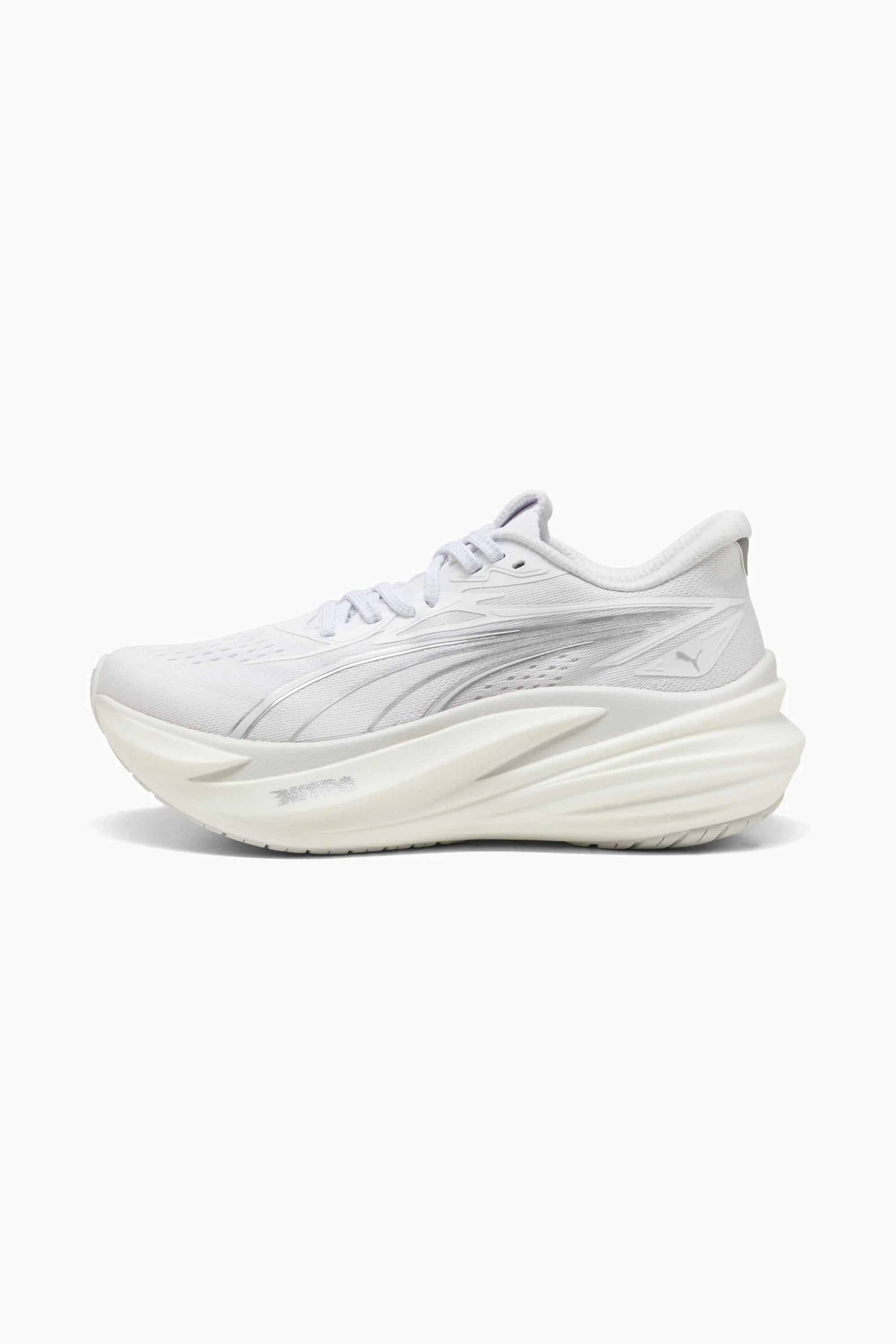 PRODUCT STORY Feel the bounce with the MagMax NITRO™ 2. Packed with the highest stack of NITROFOAM™ cushioning, it delivers an ultra-plush ride that energises every step. The engineered mesh upper keeps things cool and secure, while the PUMAGRIP outsole provides steady traction. Mile after mile, these shoes bring effortless comfort and performance. FEATURES & BENEFITS - The upper of the shoes is made with at least 30% recycled materials. DETAILS - Style: 312126_02 - Color: PUMA White-PUMA Silver - Width: Regular - Toe Type: Rounded - Fastener: Laces - Heel type: Flat - Stack Height: 46mm / 38mm - Cushioning: Max - Heel-to-toe drop: 8mm - Pronation: Overpronation - Weight: 275g (UK8) MATERIAL INFORMATION - Sockliner: 100% Textile - Outsole: 100% Rubber - Upper: 70.42% Textile, 29.58% Synthetic - Lining: 100% Textile
