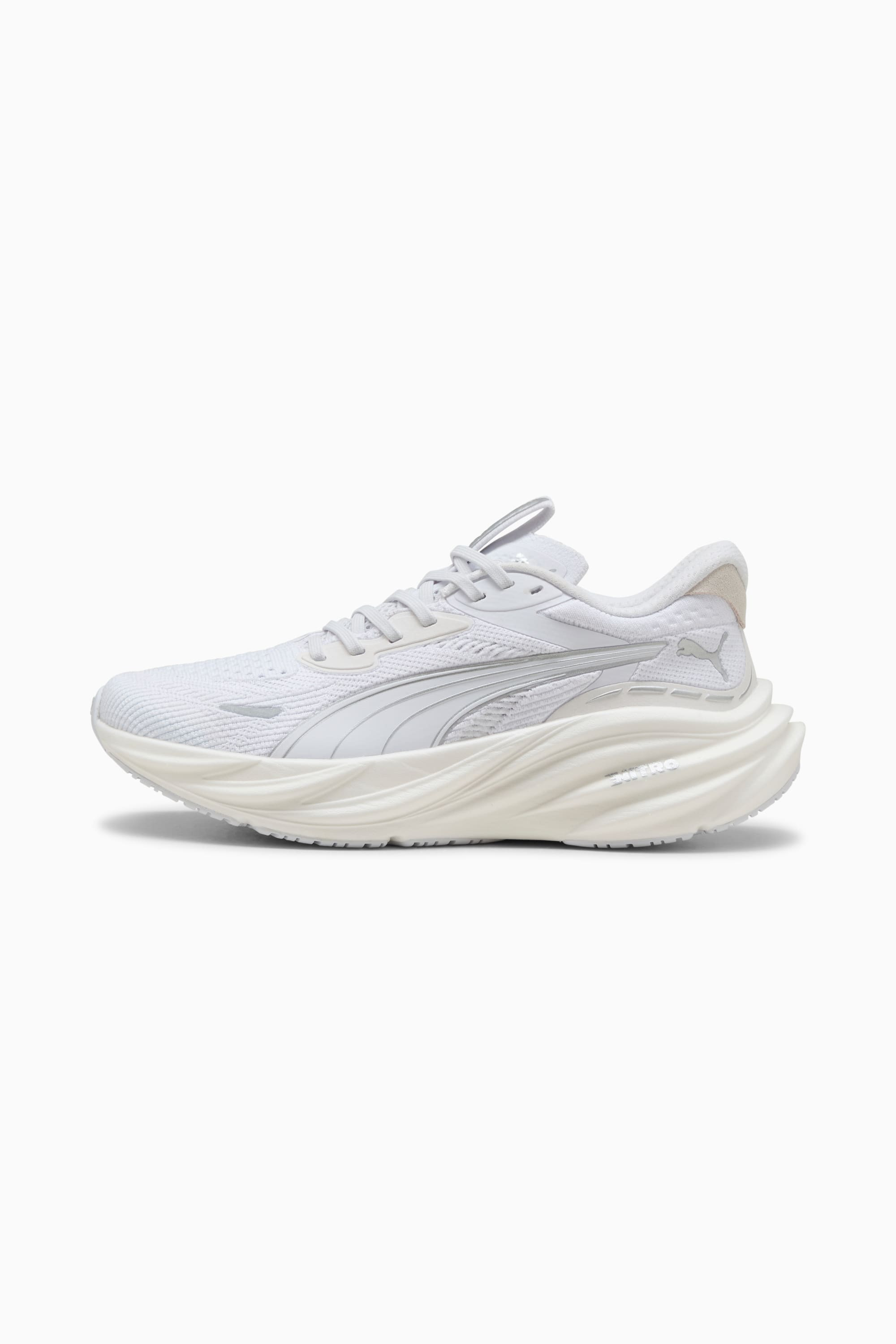 PRODUCT STORY Magnify 3 is built for supreme cushioning and all-day comfort. Designed for any run where softness and support matter most, it features a breathable engineered mesh upper and stacked NITROFOAM™ cushioning for a smooth, responsive ride. Whether you're going the distance or running purely for the joy of it, this shoe is made to magnify your comfort and keep you moving. FEATURES & BENEFITS - BREATHABILITY: Premium engineered knit material engineered for breathability and stretch, reinforced with PWRTAPE for durability and lockdown - NITROFOAM™: Innovative nitrogen-infused foam technology that uses premium raw materials to provide maximum energy return - PUMAGRIP: Outsole is made of durable rubber compound for multi-surface traction - The upper of the shoes is made with at least 30% recycled materials. DETAILS - Style: 311047_02 - Color: PUMA White-PUMA Silver - Fit: Regular - Toe type: Rounded - Fastener: Laces - Heel type: Flat - Heel-to-toe drop: 10mm - Stack Height: 40mm / 30mm - Weight (UK4.5): 215g - Recommended for neutral pronators MATERIAL INFORMATION - Midsole: 100% Synthetic - Sockliner: 100% Textile - Outsole: 100% Rubber - Upper: 75% Textile, 22% Synthetic, 3% Leather - cow - Lining: 100% Textile
