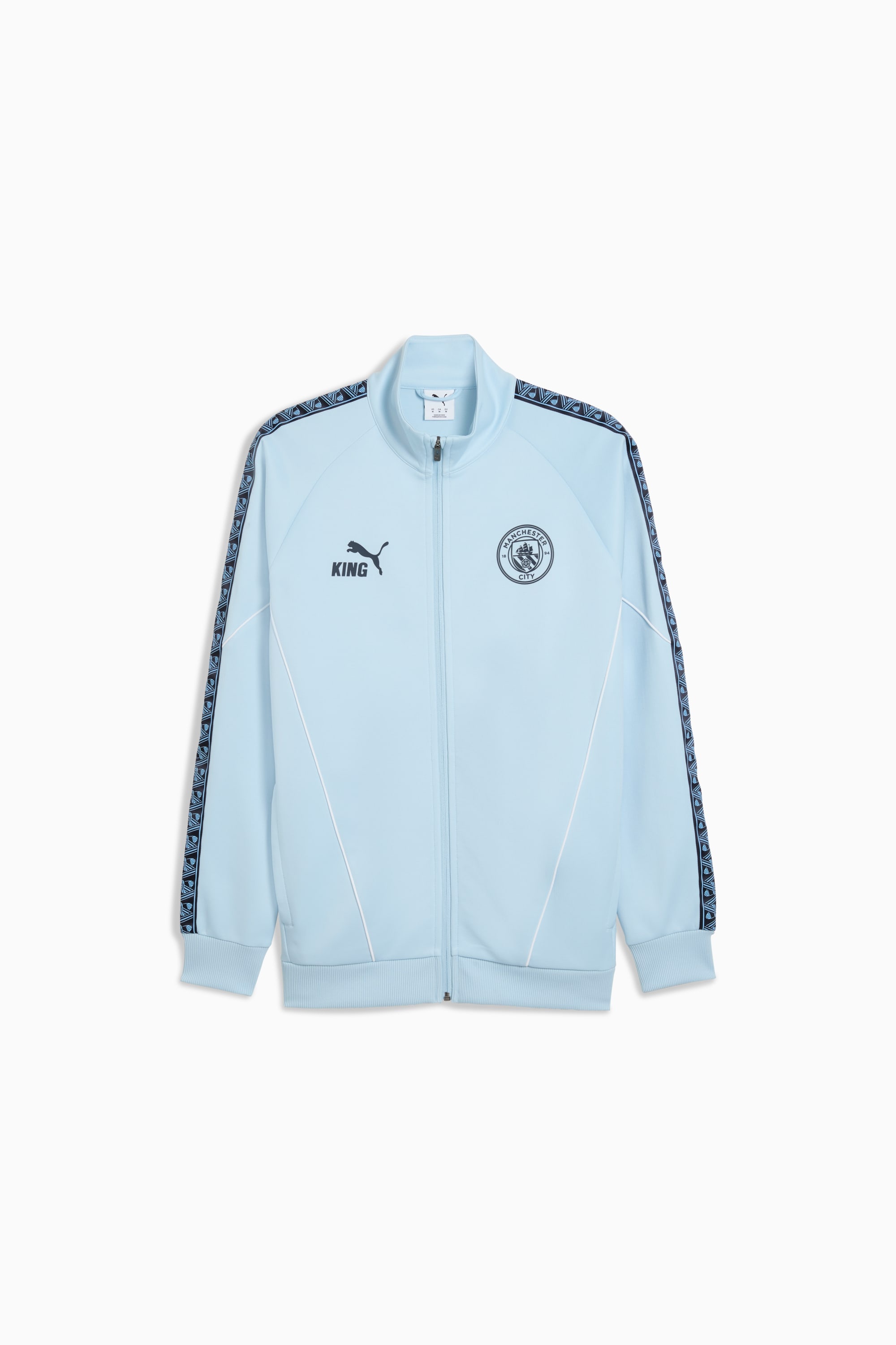 PRODUCT STORY The KING Anthem Collection channels retro vibes with a modern twist, worn by players during their walkouts before every game. With bold, vintage-inspired designs, this apparel honours your club’s legacy while showcasing your pride. Whether on the field or off, this collection brings timeless style and contemporary comfort, making it a true symbol of loyalty and tradition. FEATURES & BENEFITS - dryCELL: Highly functional materials draw sweat away from your skin and help keep you dry and comfortable during exercise - Made with at least 50% recycled materials. DETAILS - Style: 782173_10 - Color: Silver Sky-Deep Navy - Fit: Slim - Main material: Spacer - Short sleeves - Fastener: Full zip - Length: Standard jacket - Club and PUMA branding details MATERIAL INFORMATION - Trimming: 100% polyester - Shell: 63% polyester, 37% cotton - Pocket Bag: 100% polyester - Rib: 93% polyester, 7% elastane