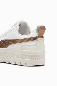 PRODUCT STORY Get ready to find your style in Mayze. We made this one for the hype girls, the street enthusiasts, the trend mavens. This stand-out silhouette takes design inspiration straight from the streets, with a stacked sole and contrasting rubber tooling for an edgy, layered look. This Glow-Up Volume version features a synthetic upper and leather Formstrip, with plenty of metallic details. FEATURES & BENEFITS - The upper of the shoes is made with at least 20% recycled materials DETAILS - Style: 398384_01 - Color: PUMA White-Vapor Gray - Regular fit - Synthetic upper - Synthetic vamp, eyestay, and heel overlays; metallic leather heel overlay - Mesh lining - Lace closure - Rubber midsole with TPU piece and rubber outsole - Metallic leather PUMA Formstrip - PUMA branding details - Platform style MATERIAL INFORMATION - Midsole: 100% Synthetic - Sockliner: 100% Textile - Outsole: 100% TR (Thermoplastic Rubber) - Upper: 78.63% Synthetic, 21.37% Leather - cow - Lining: 100% Textile