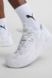 PRODUCT STORY Take flight in the MB.03 Lo. NITROFOAM™ tech and high-traction tread let you soar to the rim. Engineered mesh and TPU heel counter lock you in for intergalactic performance. Lace up, lace through the winged logo and scratch the competition in LaMelo's signature slime-inspired shoe. Out of this world. FEATURES & BENEFITS - NITRO™ infused foam technology provides superior responsiveness and cushioning in a lightweight package DETAILS - Style: 310384_03 - Color: PUMA White-Gray Fog - Breathable woven mesh upper - Seamless construction and multi-zoned materials ensure targeted support, breathability, and comfort - High abrasion tread pattern and non-slip rubber compounds - TPU heel counter adds lateral stability - Branding details: laces wrap through LaMelo's winged logo on the tongue, with "RARE" and "1of1" callouts on the pull-tab MATERIAL INFORMATION - Midsole: 100% Synthetic - Sockliner: 100% Textile - Outsole: 100% Rubber - Upper: 72% Textile, 28% Synthetic - Lining: 100% Textile