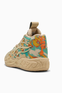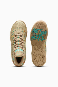 PRODUCT STORY LaMelo Ball is not of this Earth – but fortunately he comes in peace. The MB.04 is inspired by Melo’s otherworldly style of play, with an allover alien texture at the upper and Melo’s wings logo wrapped around the heel. Complete with breathable, supportive double-layered mesh and NITROFOAM™ cushioning for on-court power, this colorway stands out in earth tones and a hot pop of color at the heel. FEATURES & BENEFITS - NITROFOAM™: Advanced nitrogen-injected foam designed to provide superior responsiveness and cushioning in a lightweight package - CMEVA: PUMA's compression-moulded EVA material for lightweight performance DETAILS - Style: 312209_01 - Color: Light Sand-Aquatic-Orange Glo - Woven mesh upper material for breathable feel and support - 5D Printed Upper: A raised, multi-layered design takes over the shoe like alien tentacles - TPU heel counter adds lateral stability, along with LaMelo Branding - High abrasion tread pattern for added traction with non-slip rubber compounds - The outsole features a hovering spaceship, NOT FROM HERE and RARE wording, and flames at the heel - CMEVA foam technology providing superior responsiveness and cushioning in a lightweight package - Unique heel logo: Melo’s own LaFrance logo at the heel - Delivered in exclusive special packaging MATERIAL INFORMATION - Midsole: 100% Synthetic - Sockliner: 100% Textile - Outsole: 100% Rubber - Upper: 59% Synthetic, 41% Textile - Lining: 100% Textile